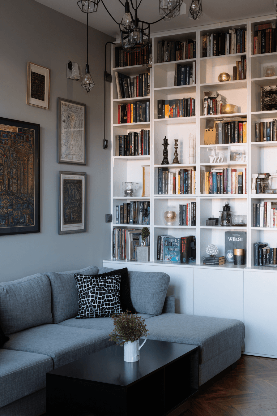 Custom storage solutions enhance this grey couch living room with both function and style. The grey couch is complemented by built-in shelving. These features keep the space organized while adding personality. Clean lines maintain a modern look. The space feels curated and polished. Explore more grey couch living room ideas with custom features.