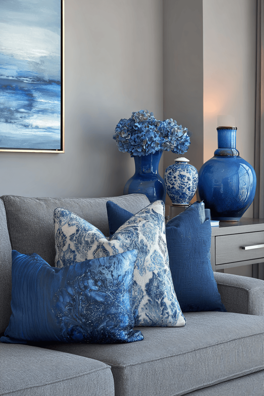 A cool-toned palette sets a relaxed mood in this grey couch living room with effortless balance. The grey couch blends seamlessly with soft blues and airy neutrals. This pairing creates a peaceful and modern feel. Layered textiles add depth and comfort. The space feels calm and cohesive. Explore more grey couch living room ideas with cool color palettes.
