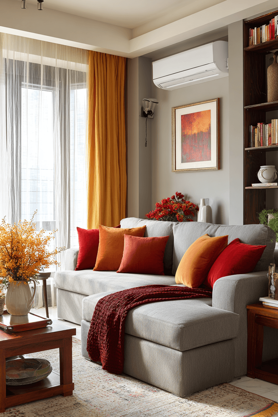 Warm earthy tones bring energy and depth into this grey couch living room while maintaining a cozy feel. The grey couch contrasts beautifully with shades like rust and terracotta. Wooden finishes enhance the inviting atmosphere. Soft lighting adds warmth throughout the space. The overall look feels grounded and stylish. Discover more grey couch living room ideas with warm accents.