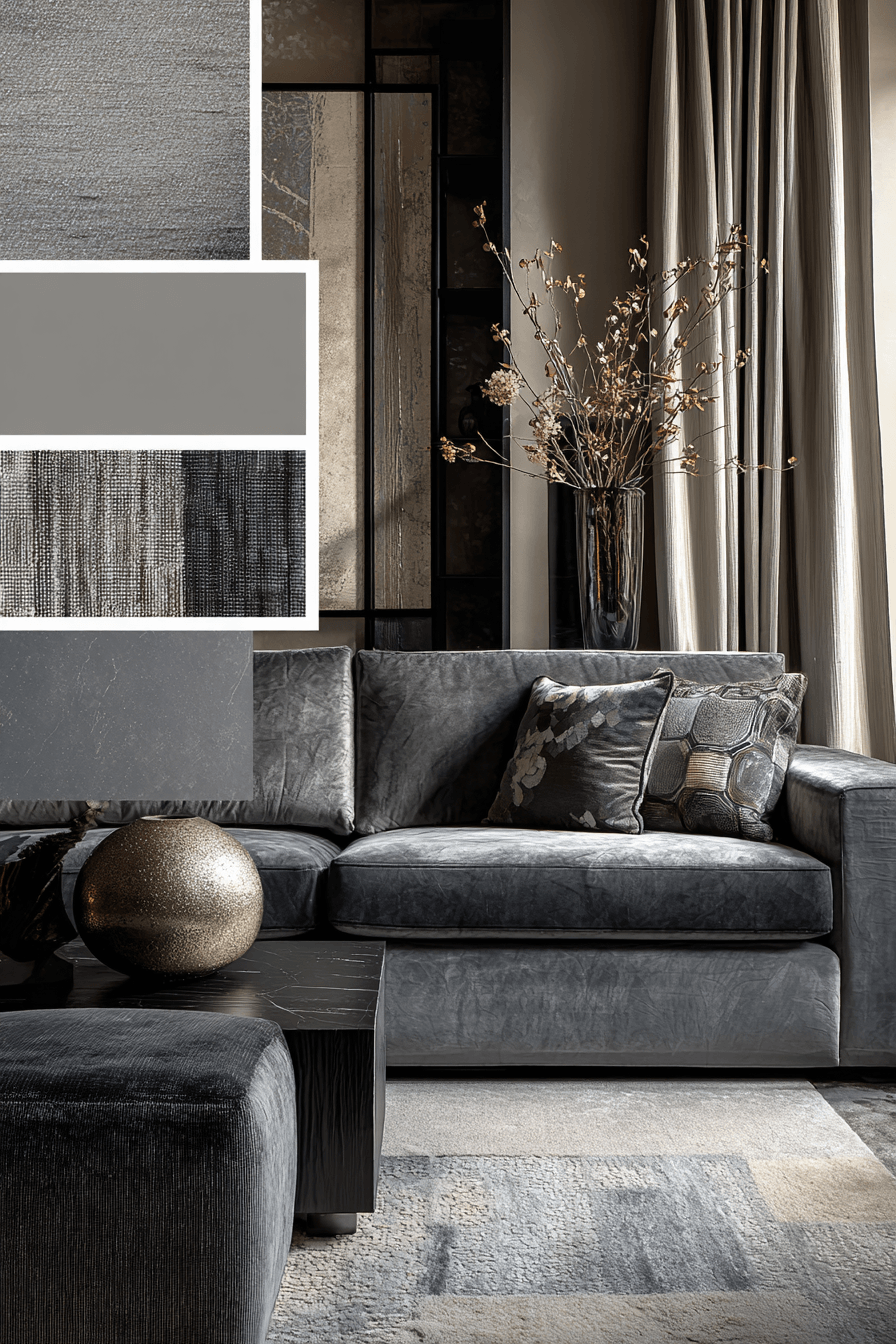 Velvet textures introduce softness and luxury into this grey couch living room with a rich feel. The grey couch becomes more inviting with plush finishes. Jewel-toned accents add bold contrast and depth. Metallic touches enhance the upscale vibe. The space feels cozy yet refined. Discover more grey couch living room ideas with luxurious textures.
