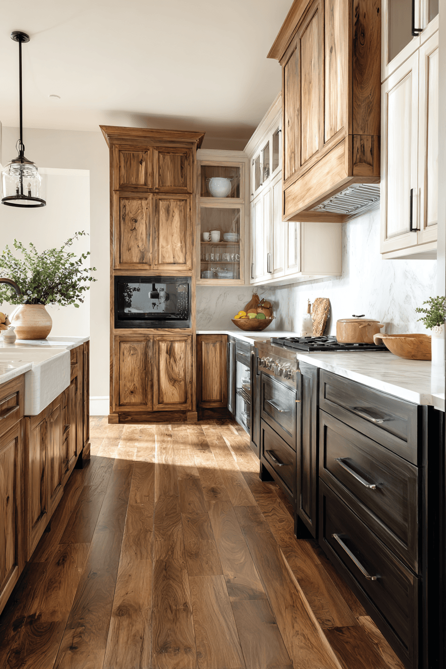Mixing hickory kitchen cabinets with other wood types creates a rich and layered design. Combining different grains adds visual interest and contrast. This approach makes the space feel curated and unique. It also enhances the overall depth of the kitchen. Hickory kitchen cabinets remain the focal point. Explore more mixed wood design ideas.