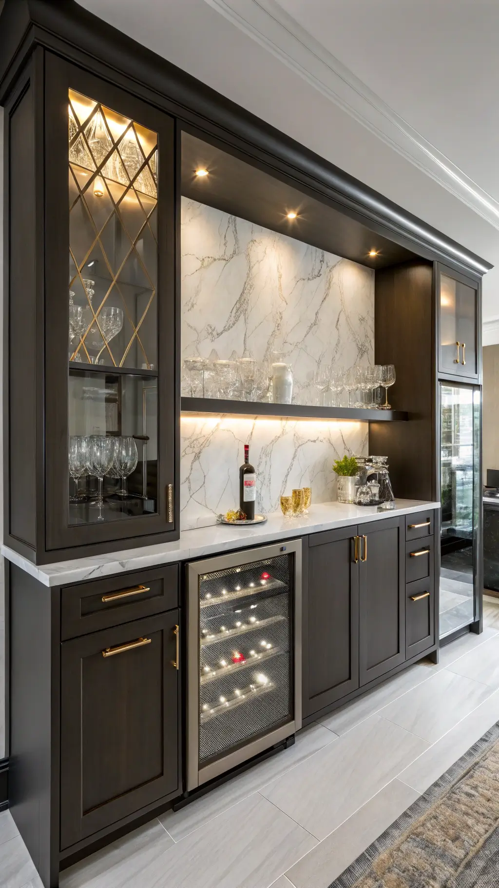 - Dramatic Wet Bar: White quartz + Gold hardware + Full Iron Ore cabinetry