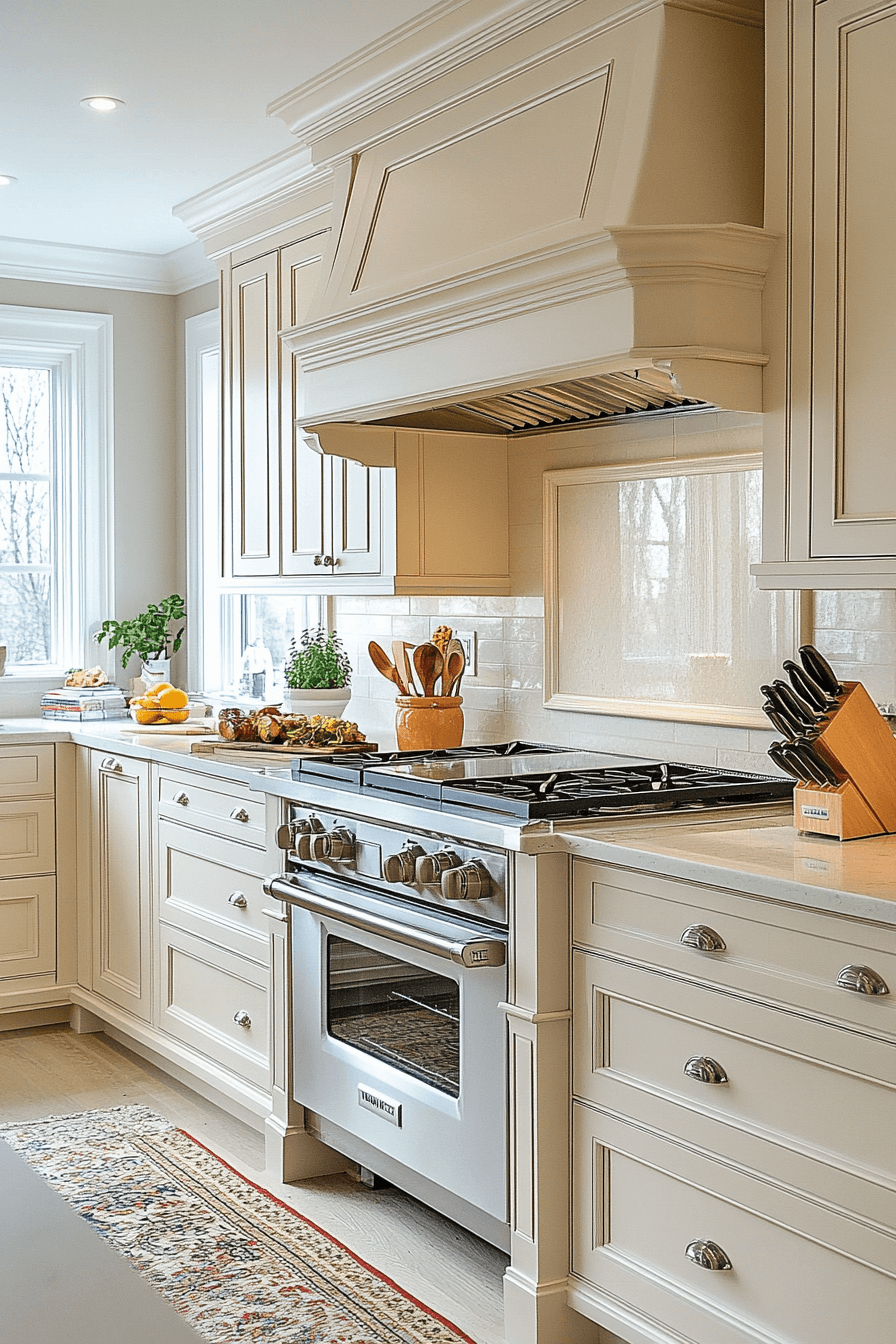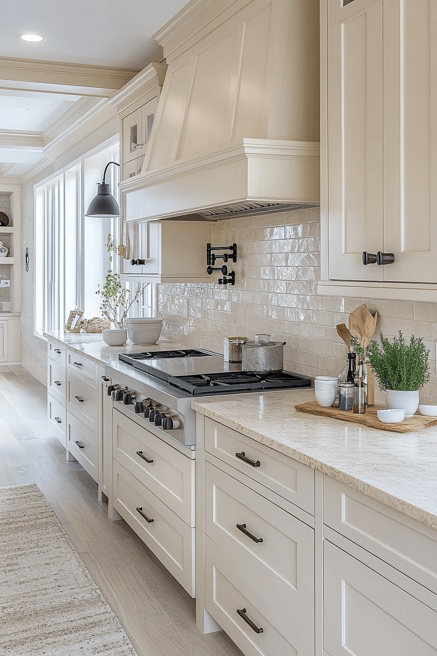 Calm versatility anchors beige-based kitchen cabinet color ideas. Soft neutral tones create warmth without heaviness. Beige cabinetry blends easily with nearly every color palette. The kitchen feels welcoming and timeless. It’s a design-safe choice with lasting appeal.