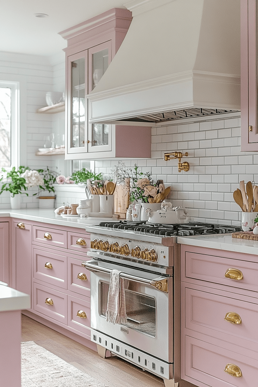 Delicate warmth softens the space with blush-inspired kitchen cabinet color ideas. Pale pink tones add charm without overpowering the design. Blush cabinets pair beautifully with gray, brass, and white finishes. The effect feels modern and calming. It’s a gentle way to stand out.