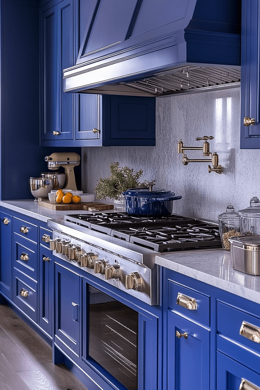 Moody sophistication defines indigo-inspired kitchen cabinet color ideas. This deep hue offers a dramatic alternative to navy. Indigo pairs beautifully with marble and gold accents. The space feels confident and luxurious. It’s perfect for high-impact kitchens.