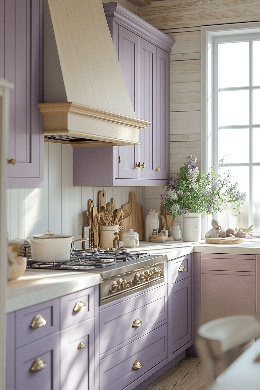 Soft creativity defines lavender-inspired kitchen cabinet color ideas. This pastel shade introduces calm with a modern twist. Lavender cabinets work beautifully with marble and brushed silver. The look feels gentle and fresh. It’s perfect for serene yet expressive kitchens.