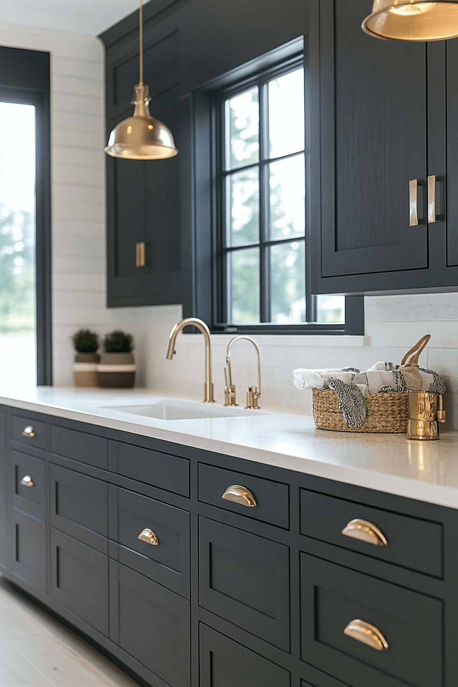 Balanced boldness appears with charcoal-focused kitchen cabinet color ideas. This deep neutral adds drama without overwhelming the room. Charcoal cabinets pair seamlessly with stone, metal, and wood. The look feels sleek and grounded. It’s also incredibly practical.