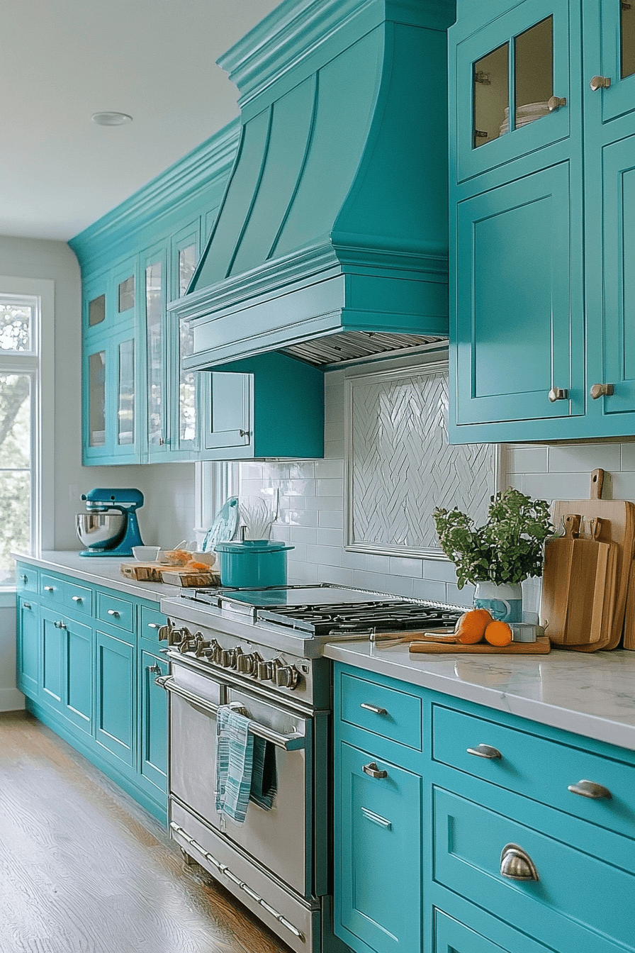 Expressive charm shines with turquoise kitchen cabinet color ideas. This blue-green shade adds instant personality and fun. Turquoise cabinetry pairs effortlessly with white and copper accents. The space feels lively and creative. It’s perfect for eclectic kitchens.
