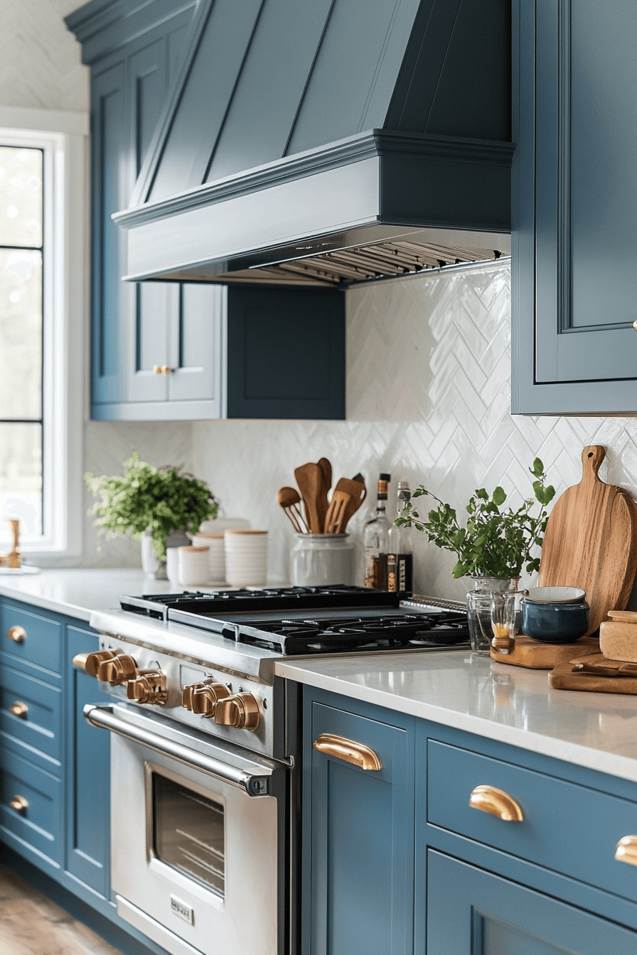 Strong yet timeless appeal emerges with navy-driven kitchen cabinet color ideas. This deep blue shade grounds the kitchen with confidence. Navy cabinets look stunning alongside brass, white stone, or marble. The effect feels luxurious without excess. It’s perfect for adding dramatic elegance.