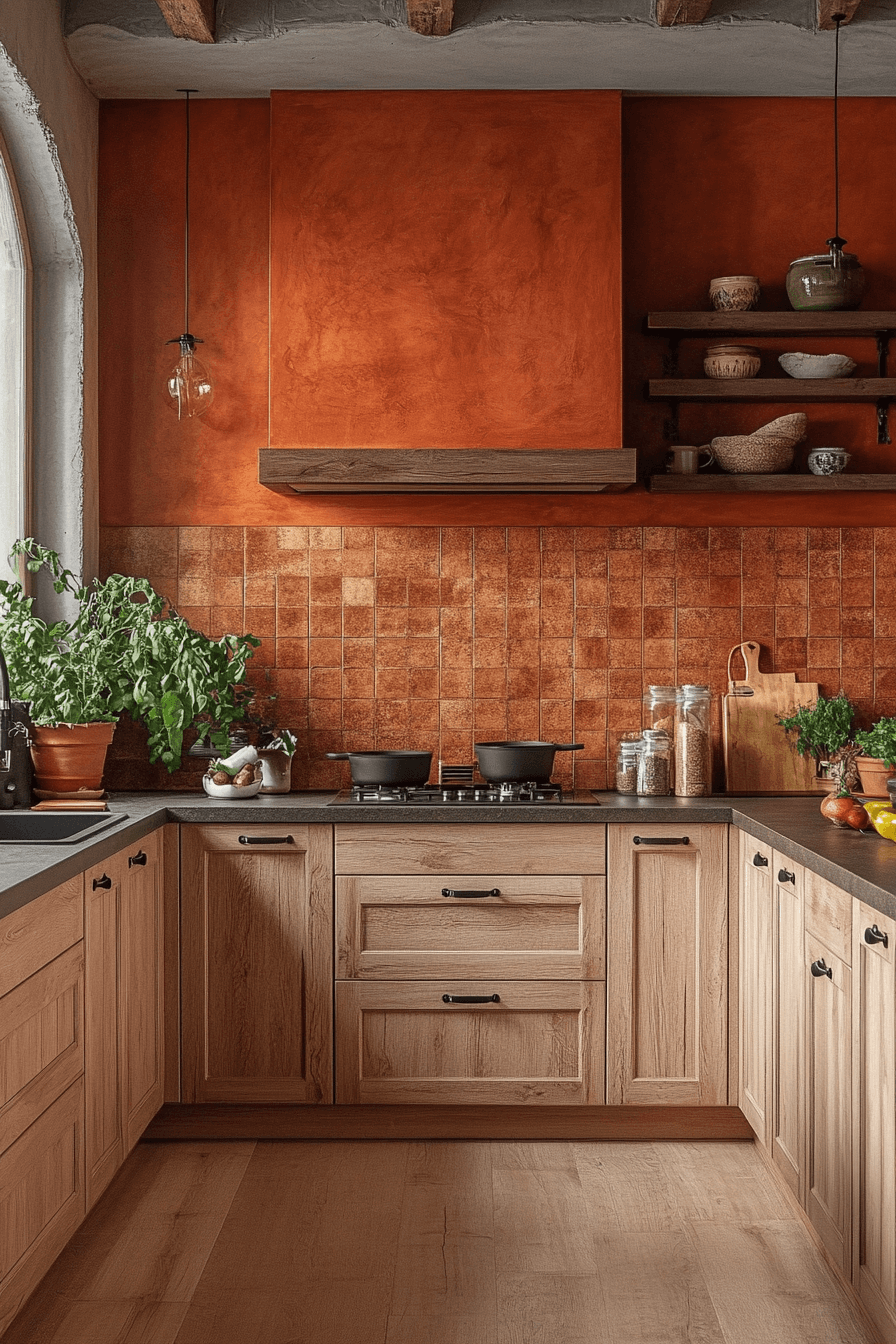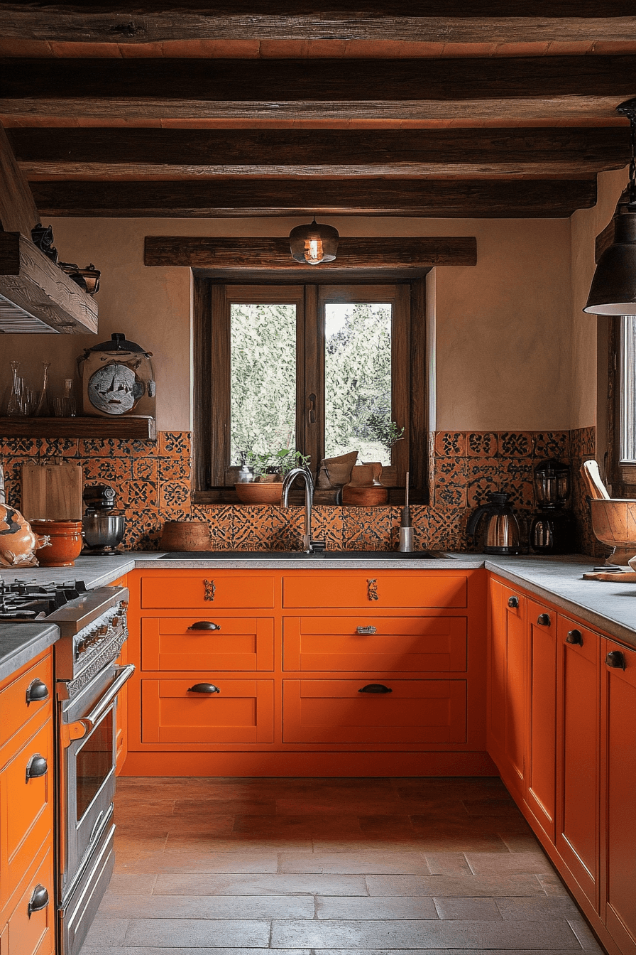 Rustic joy fills the room with Tuscan-style kitchen cabinet color ideas. This warm orange hue adds Mediterranean flair. It pairs effortlessly with tile, brass, and dark wood. The kitchen feels festive and inviting. Perfect for lively gathering spaces.