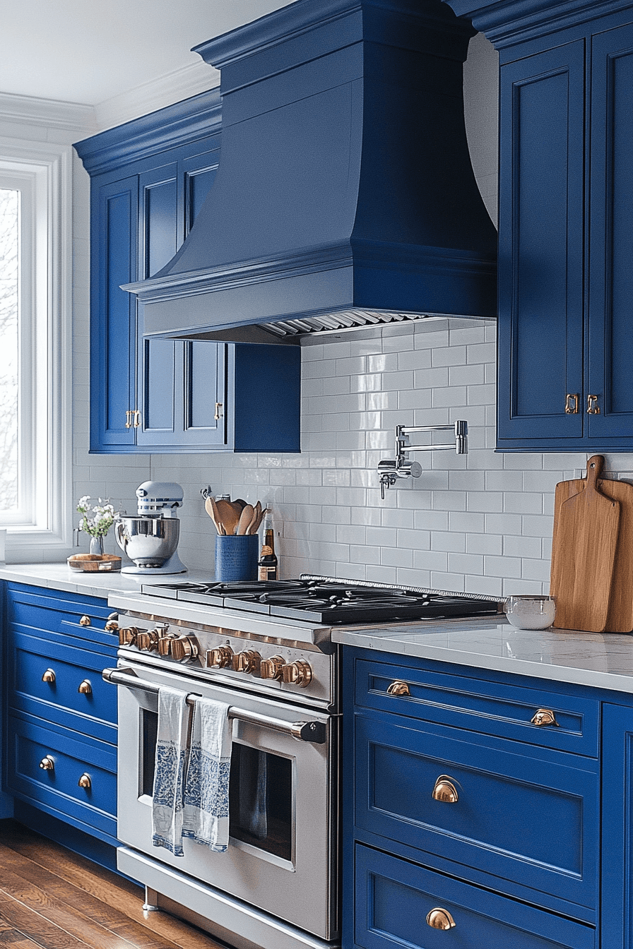 Electric personality takes over with cobalt-driven kitchen cabinet color ideas. This vivid blue transforms cabinetry into a focal point. Cobalt pairs well with wood textures and neutral backdrops. The result feels energetic and contemporary. It’s ideal for bold design lovers.