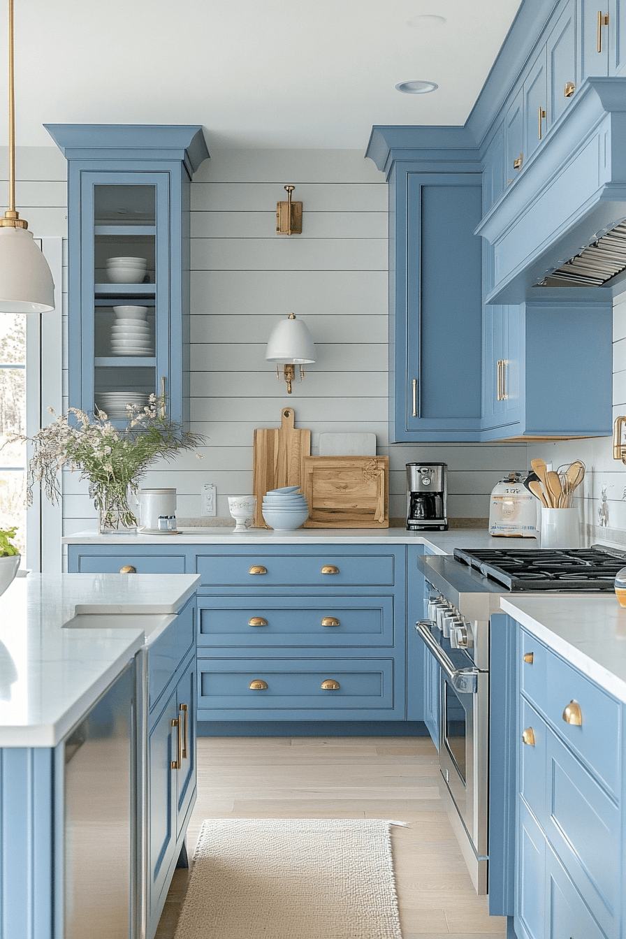 Relaxed coastal charm defines blue-inspired kitchen cabinet color ideas. Soft ocean hues create a soothing, breezy atmosphere. Lighter blues feel airy, while deeper shades add elegant depth. Blue cabinetry pairs beautifully with whites, sands, and brushed metals. The space feels calm and refreshing.