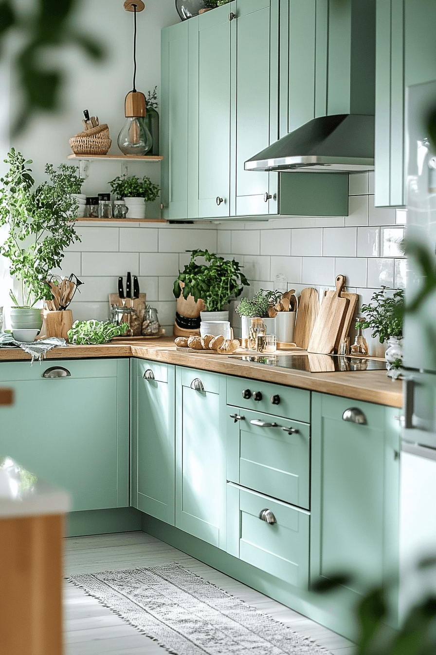 Fresh personality shines with mint-toned kitchen cabinet color ideas. This light green shade keeps kitchens feeling bright and airy. Mint cabinetry reflects light and softens the space. It pairs beautifully with brass, wood, and creamy whites. The vibe feels playful yet clean.