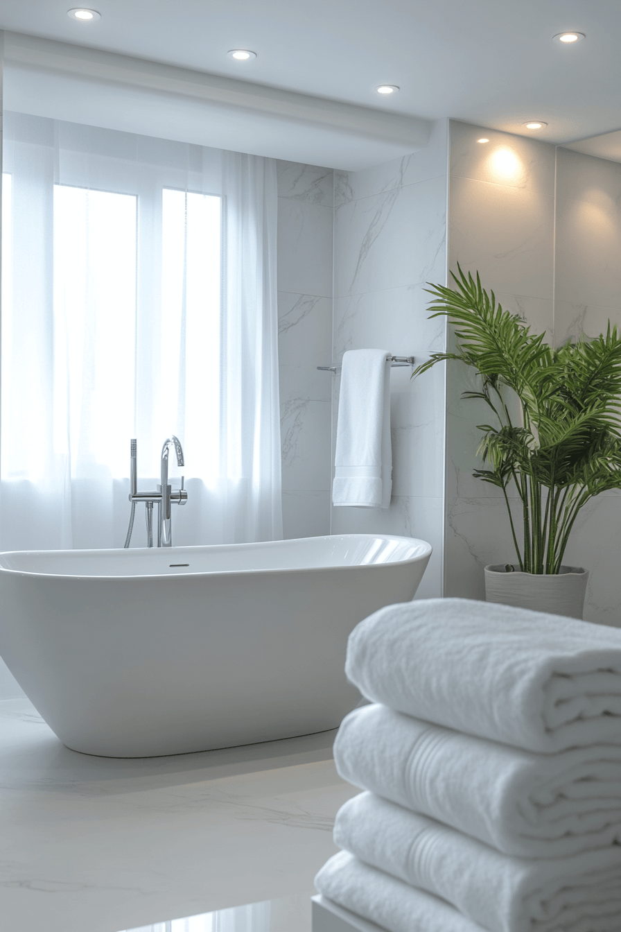 Soft whites shape this serene luxury bathroom design with layered elegance. Subtle tone variations keep the space visually interesting. Marble and porcelain add refinement without distraction. Gentle lighting enhances the calm atmosphere. The space feels pure and polished.