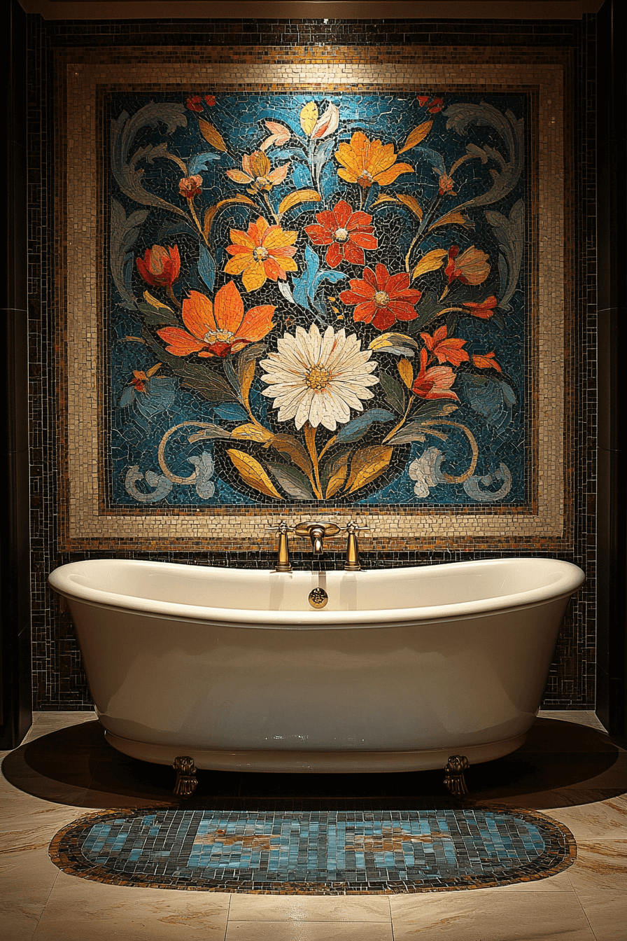 Mosaic detailing transforms this luxury bathroom design into an artistic focal point. Intricate tilework adds personality and craftsmanship. Lighting highlights each pattern beautifully. The space feels curated and expressive. Design becomes storytelling.