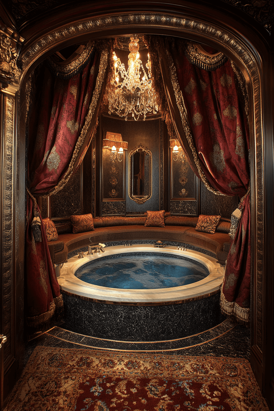 This royal-inspired luxury bathroom design blends grandeur with comfort. Ornate details create visual drama without overwhelming the space. Warm lighting enhances richness and depth. Plush elements soften the regal aesthetic. The result feels majestic yet livable.