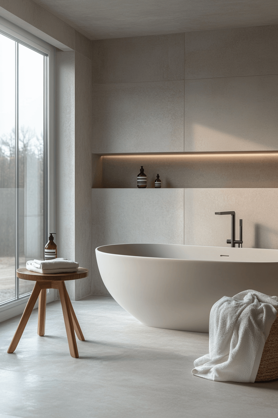 Natural limestone defines this luxury bathroom design with warmth and organic beauty. Soft textures create a grounded, spa-like environment. Subtle lighting highlights the stone’s character. Freestanding fixtures enhance comfort and elegance. The space feels timeless and calming.