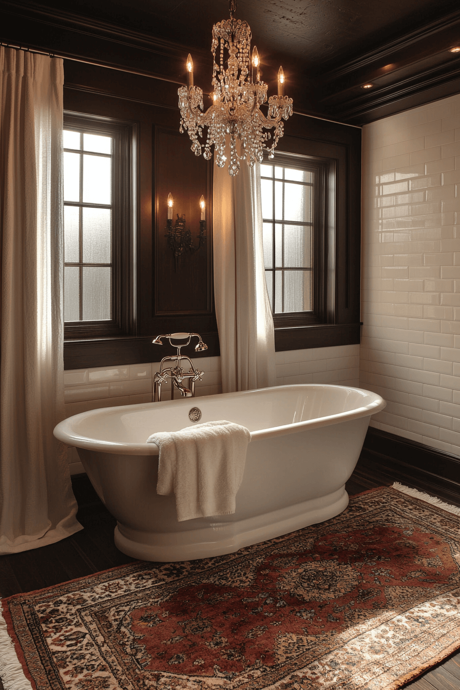 Statement lighting defines this chandelier-focused luxury bathroom design. A bold fixture becomes the room’s centerpiece. Reflective surfaces amplify its glow. The atmosphere feels cinematic and refined. Lighting transforms the space.