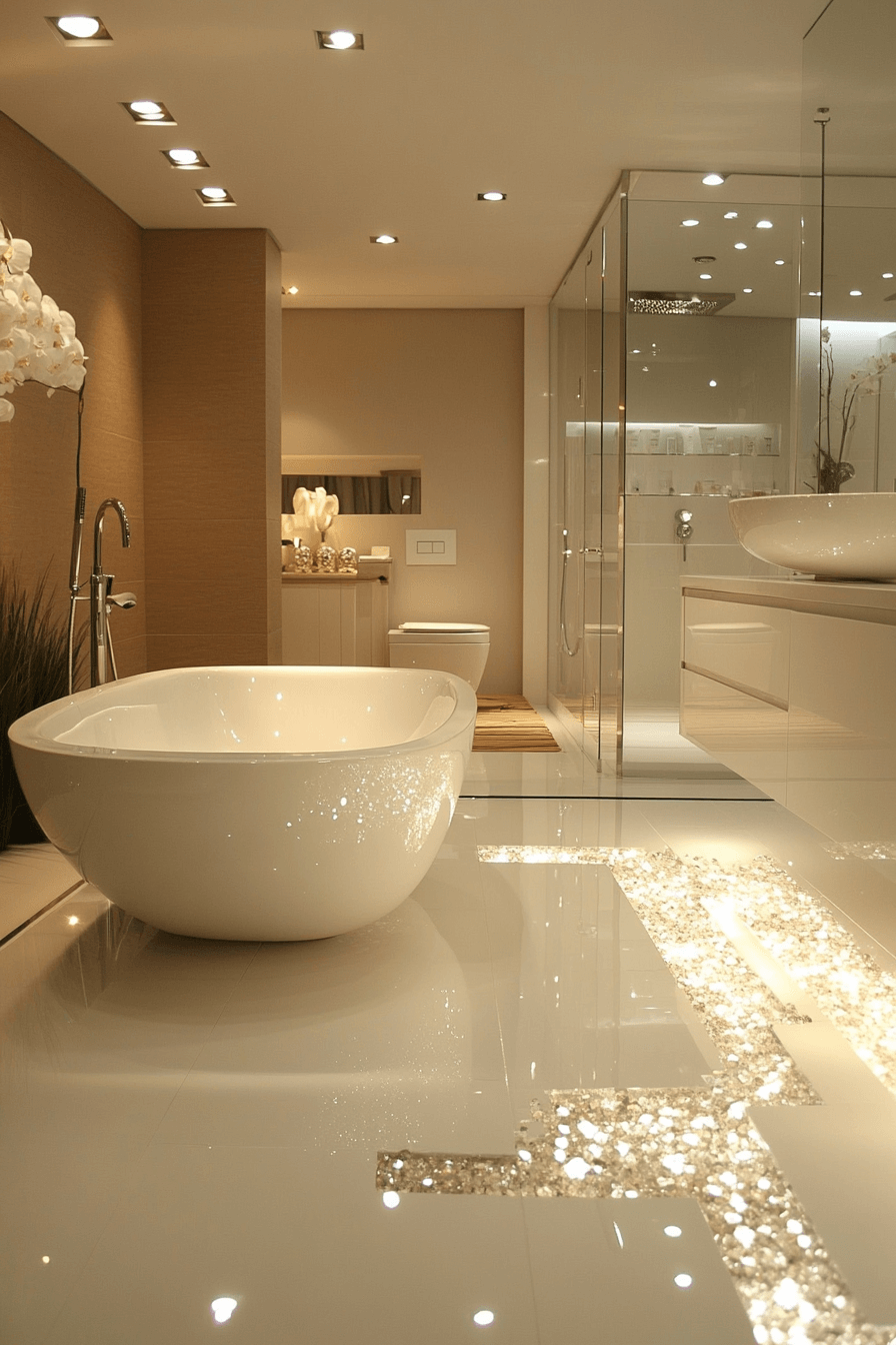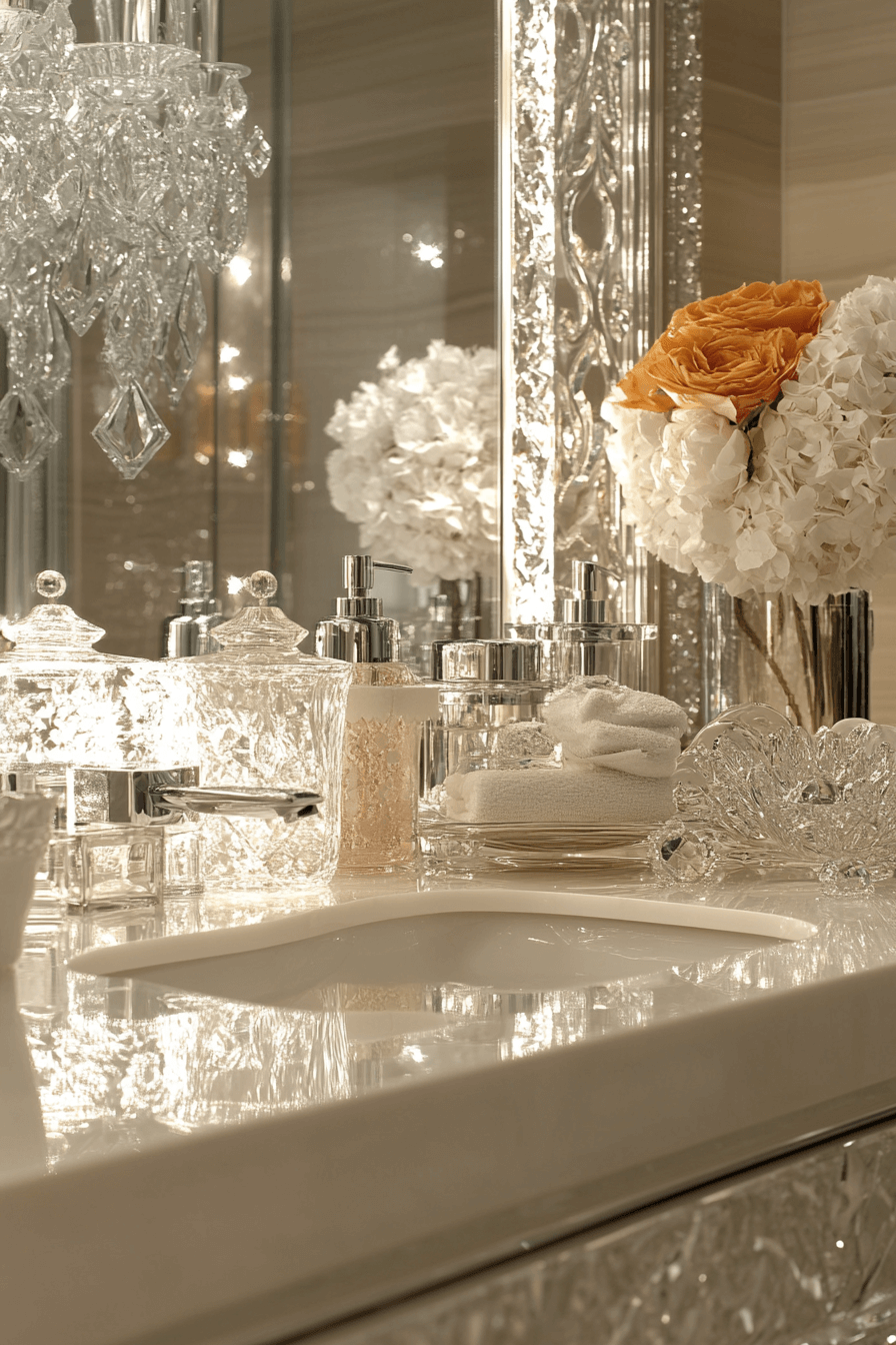 Crystal accents bring sparkle to this luxury bathroom design without excess. Light-catching details enhance sophistication. Neutral surfaces maintain balance. Soft lighting creates a radiant finish. The space feels luminous and elegant.