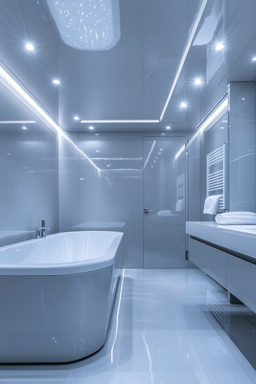 High-gloss finishes energize this contemporary luxury bathroom design. Reflective surfaces expand visual space. Clean lines maintain modern clarity. Light enhances shine without glare. The space feels vibrant and upscale.