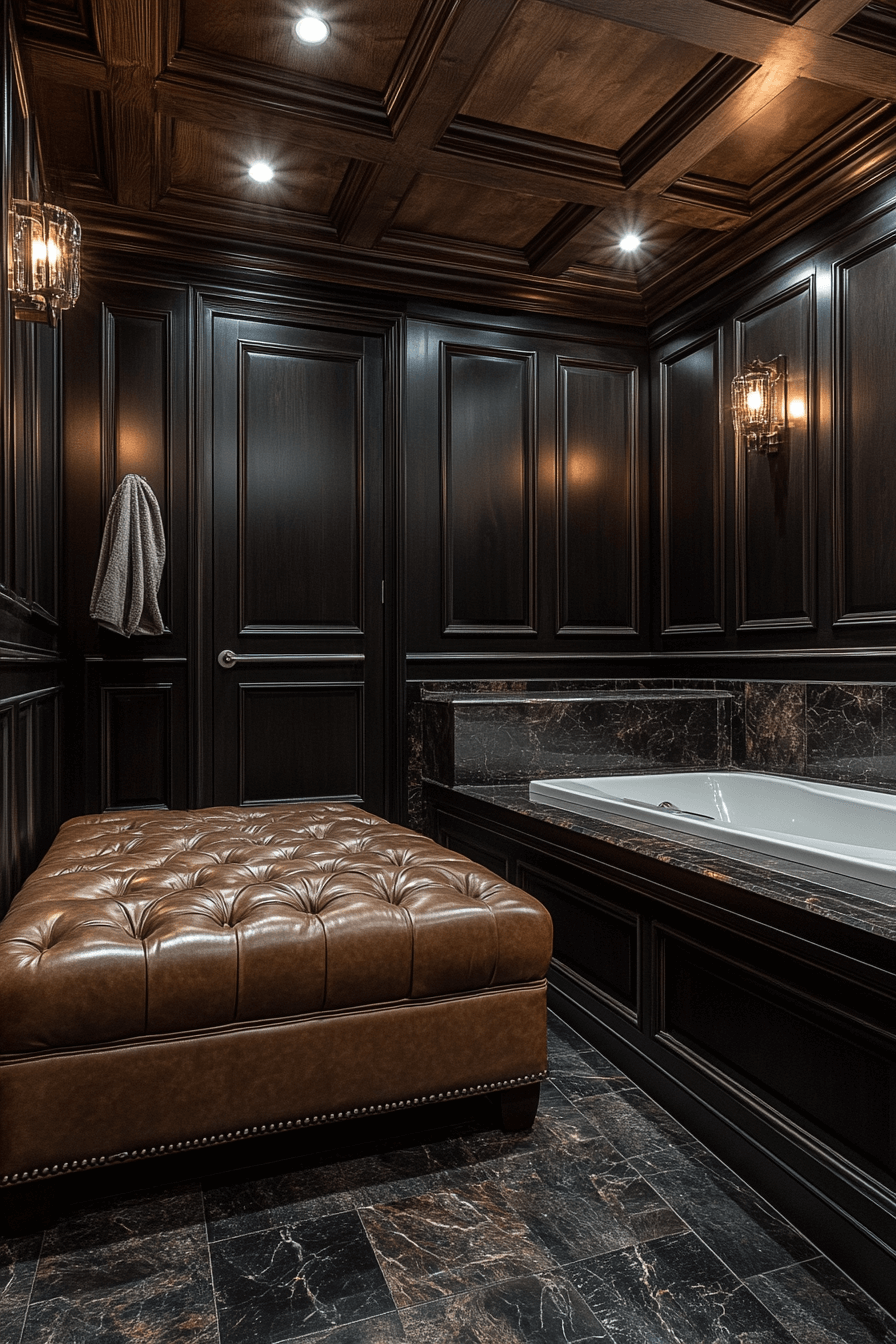 Executive styling defines this luxury bathroom design with strength and refinement. Dark tones convey confidence. Textural contrast adds warmth. Balanced lighting softens the bold palette. The space feels powerful yet inviting.