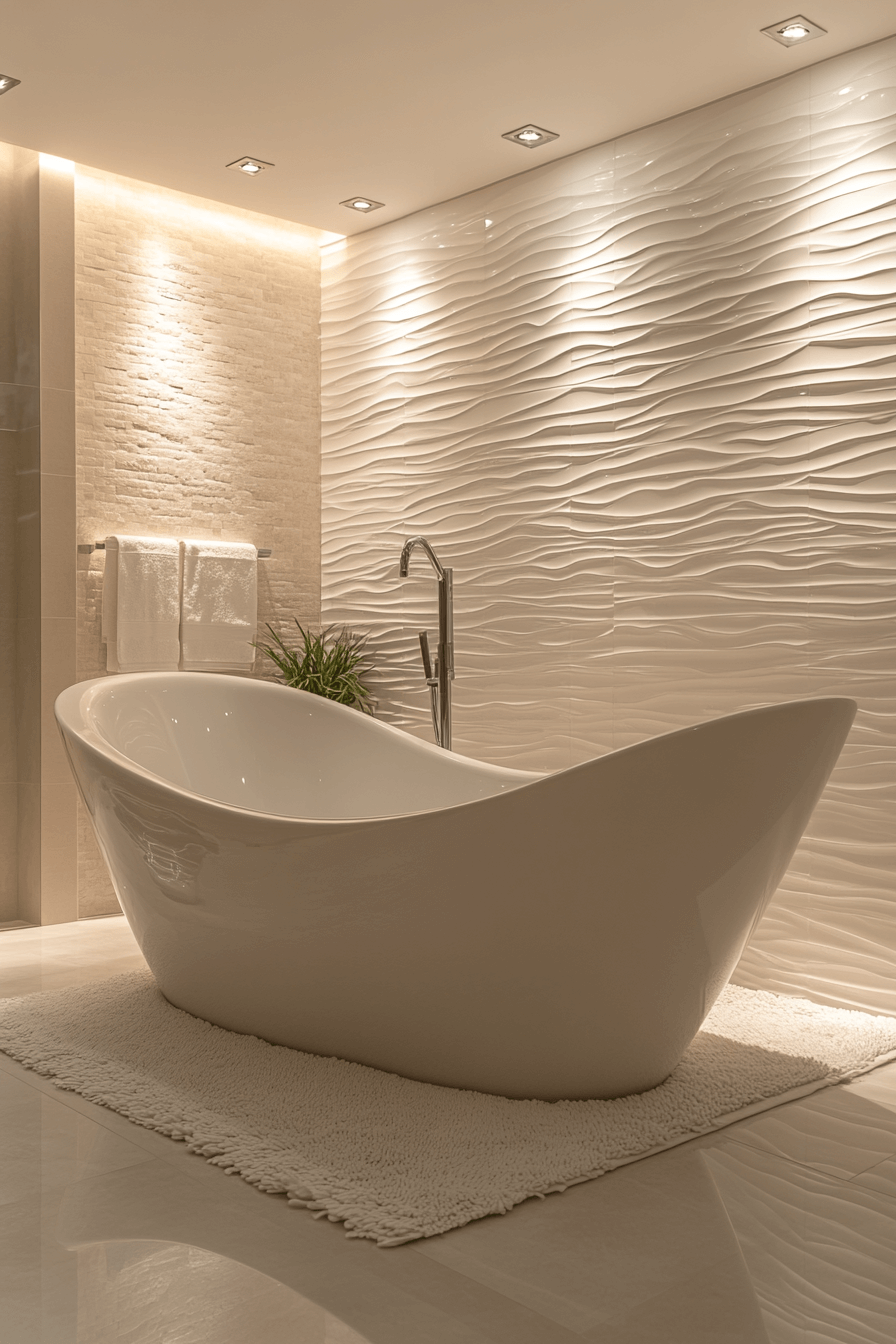 Textural richness defines this luxury bathroom design through unexpected fabric elements. Soft materials contrast beautifully with stone and tile. Warm lighting enhances depth and comfort. The space feels intimate yet upscale. Every surface invites touch.