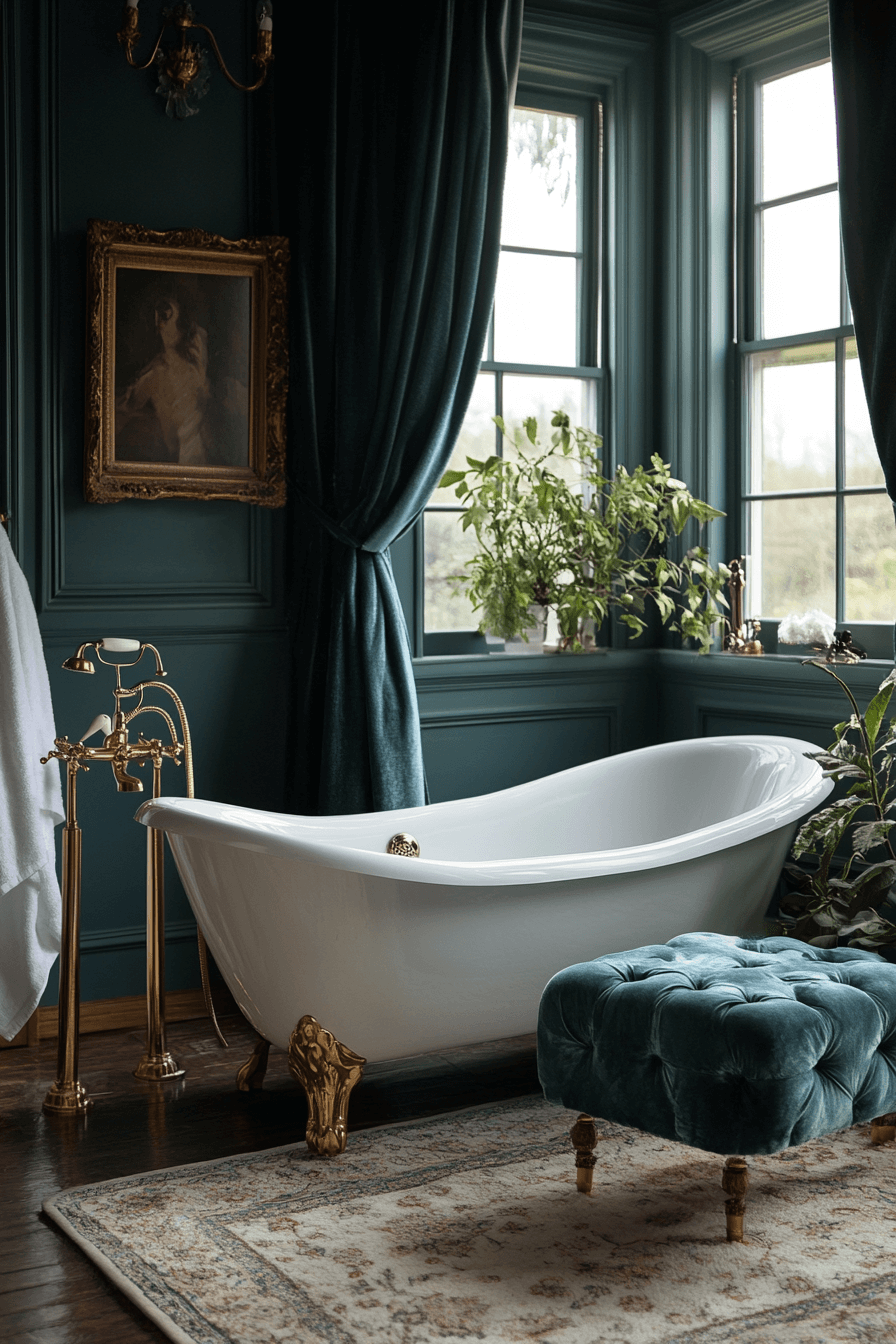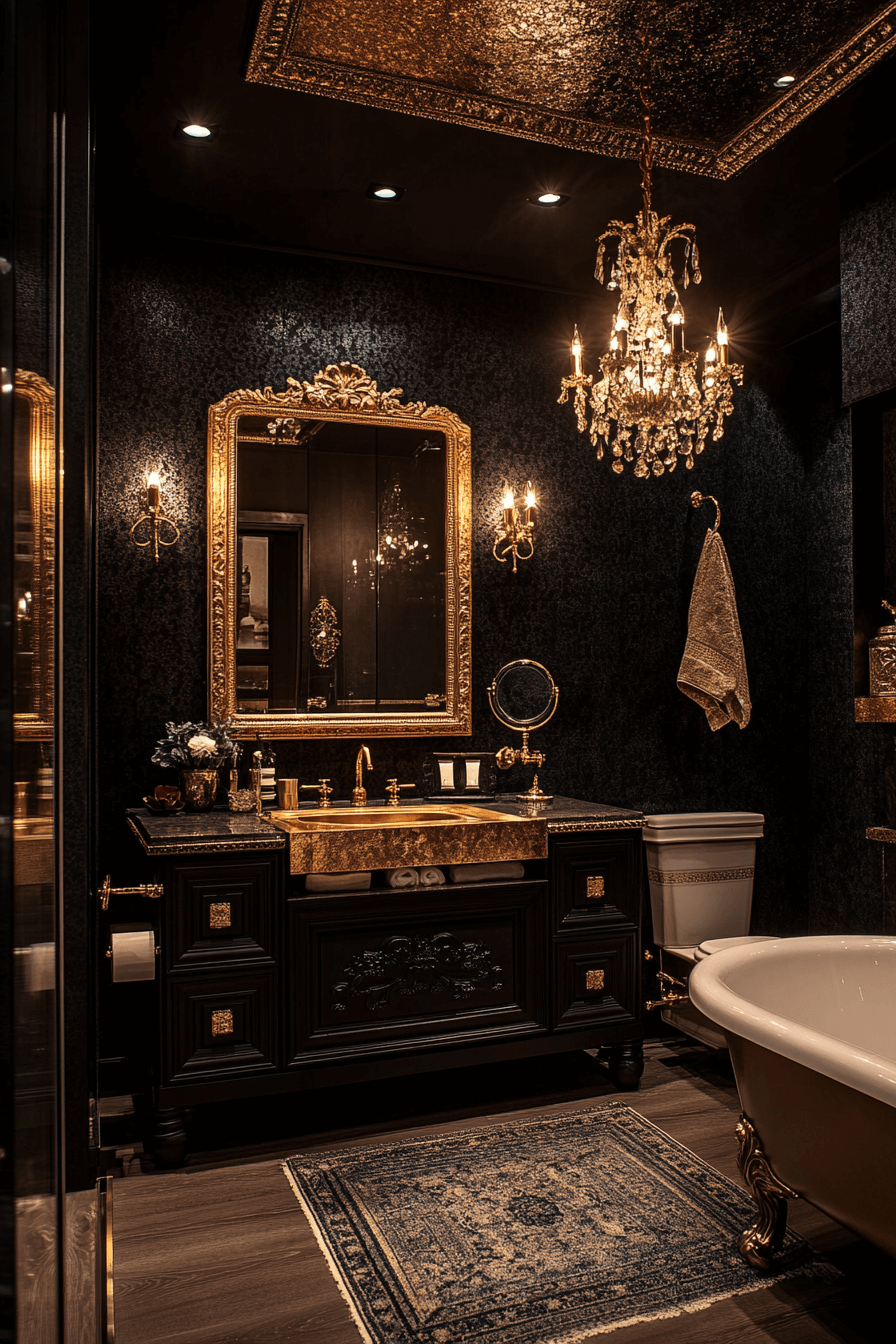 Gold accents bring striking refinement to this luxury bathroom design, adding warmth and visual drama. Metallic fixtures reflect light beautifully against stone or dark surfaces. Each detail feels deliberate rather than overpowering. Layered finishes enhance the sense of richness throughout the space. The look balances boldness with restraint.
