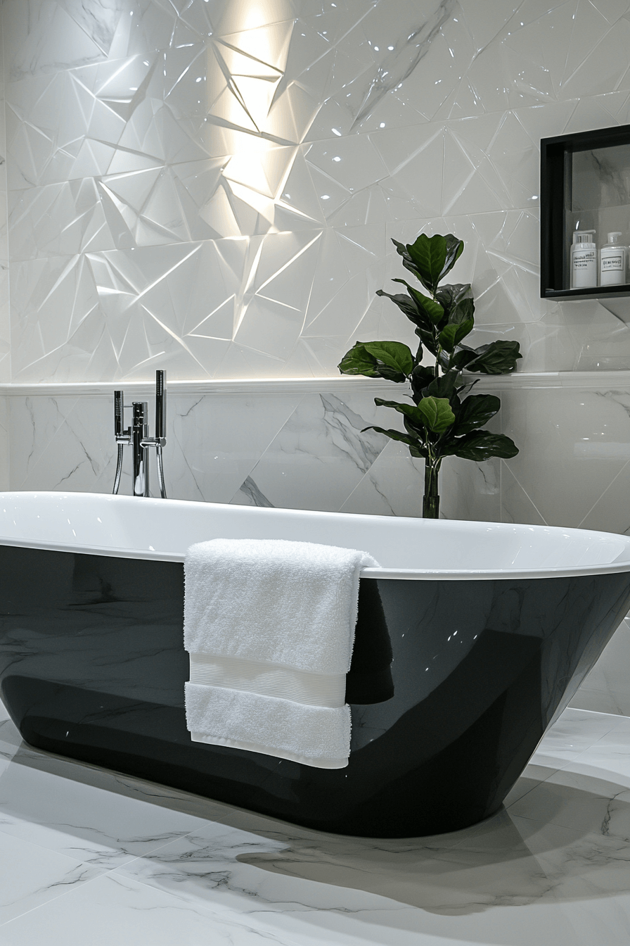 A monochrome palette defines this black-and-white luxury bathroom design with timeless appeal. Strong contrast adds clarity and structure to the space. Polished finishes keep the look sleek and modern. Metallic accents refine the overall aesthetic. The result is bold, classic, and balanced.