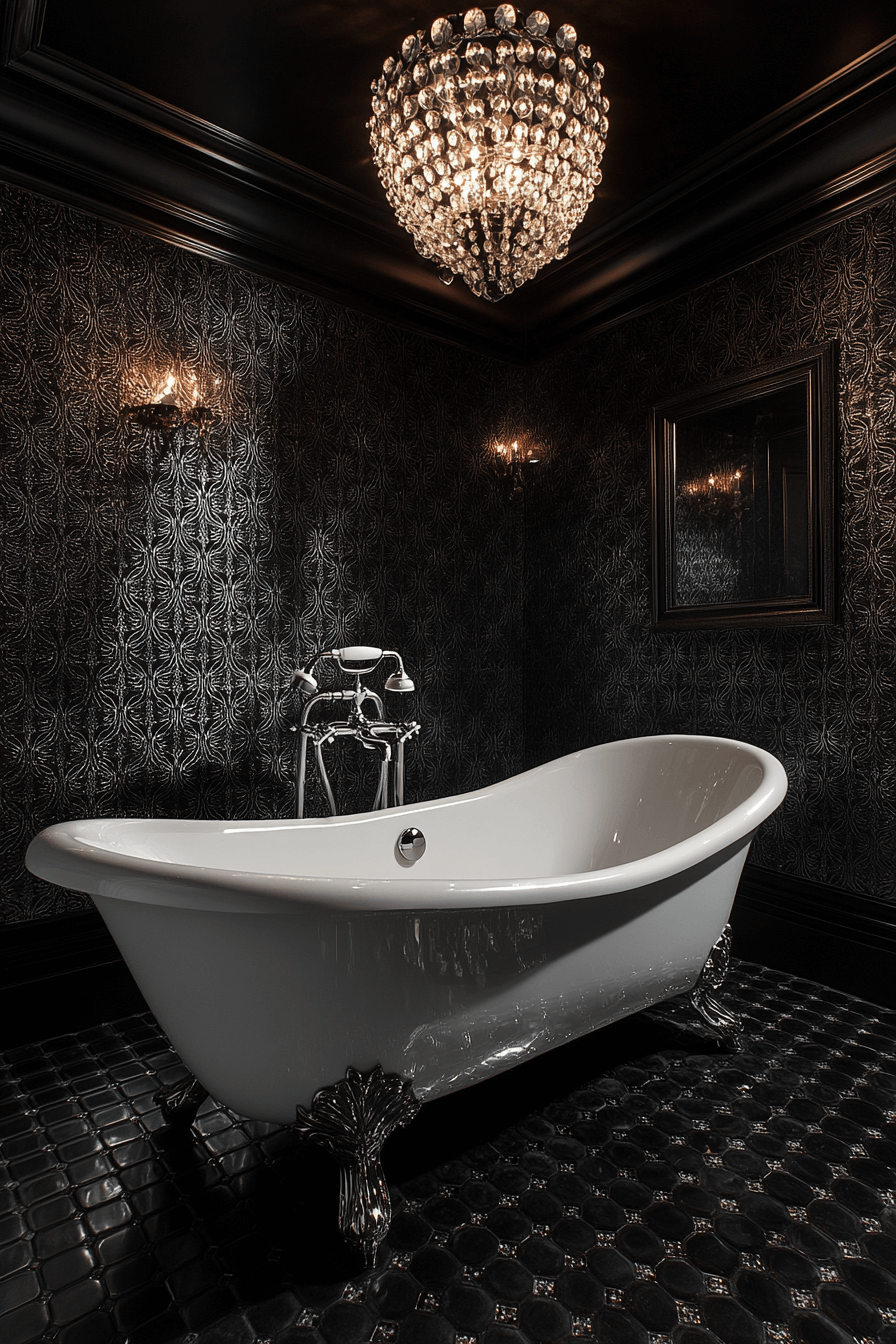 Art Deco influence shapes this luxury bathroom design through geometry and glamour. Bold tile patterns and rich materials bring visual rhythm and depth. Metallic finishes add vintage-inspired sparkle. Dramatic lighting enhances the layered design. The space feels expressive yet refined.