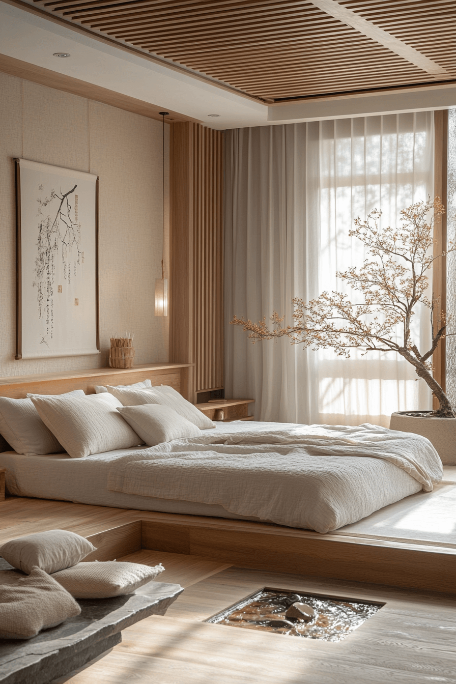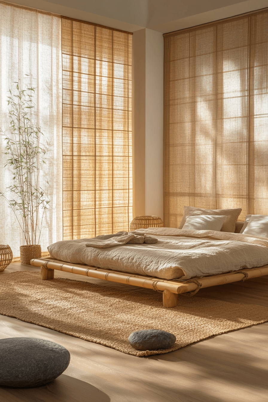 Harmony defines this modern Zen minimalistic bedroom. Neutral tones and natural textures encourage focus and relaxation. Furniture remains understated to preserve balance. Minimal accents subtly reflect Zen influence. The minimalistic bedroom feels restorative and centered.