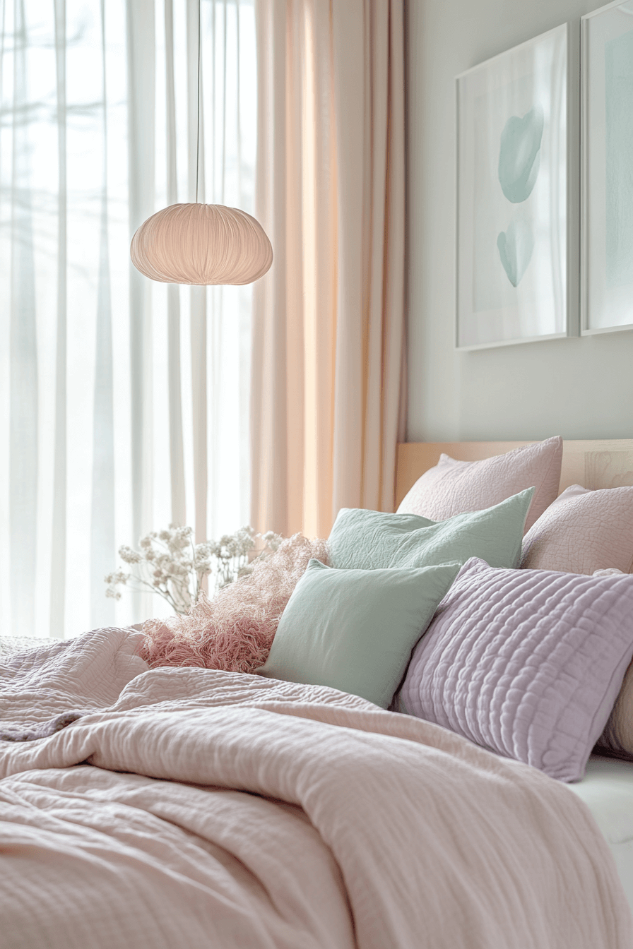 Gentle pastel shades add personality to this minimalistic bedroom without overpowering the design. Clean furniture lines keep the space open and balanced. Soft color introduces warmth while maintaining visual calm. Decor stays intentionally minimal. This minimalistic bedroom feels light and soothing.