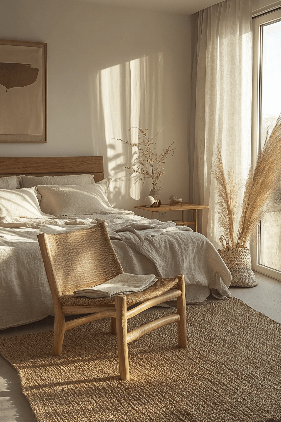 Grounded materials and soothing hues shape this tranquil minimalistic bedroom. Natural wood tones and breathable textiles promote a relaxed, mindful atmosphere. Minimal furnishings help the space feel purposeful and uncluttered. Soft lighting enhances the calming mood without distraction. This minimalistic bedroom feels like a retreat from daily stress.