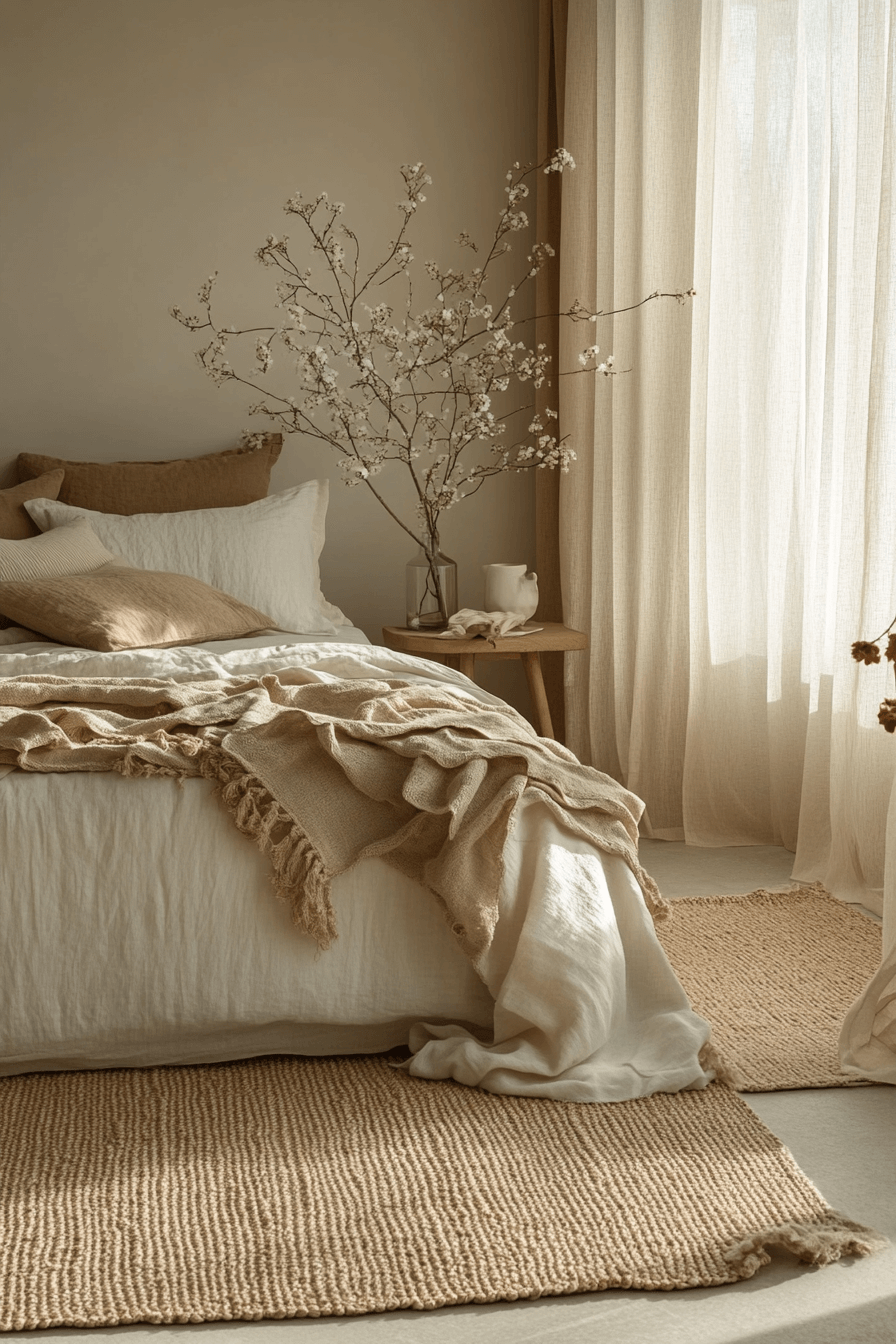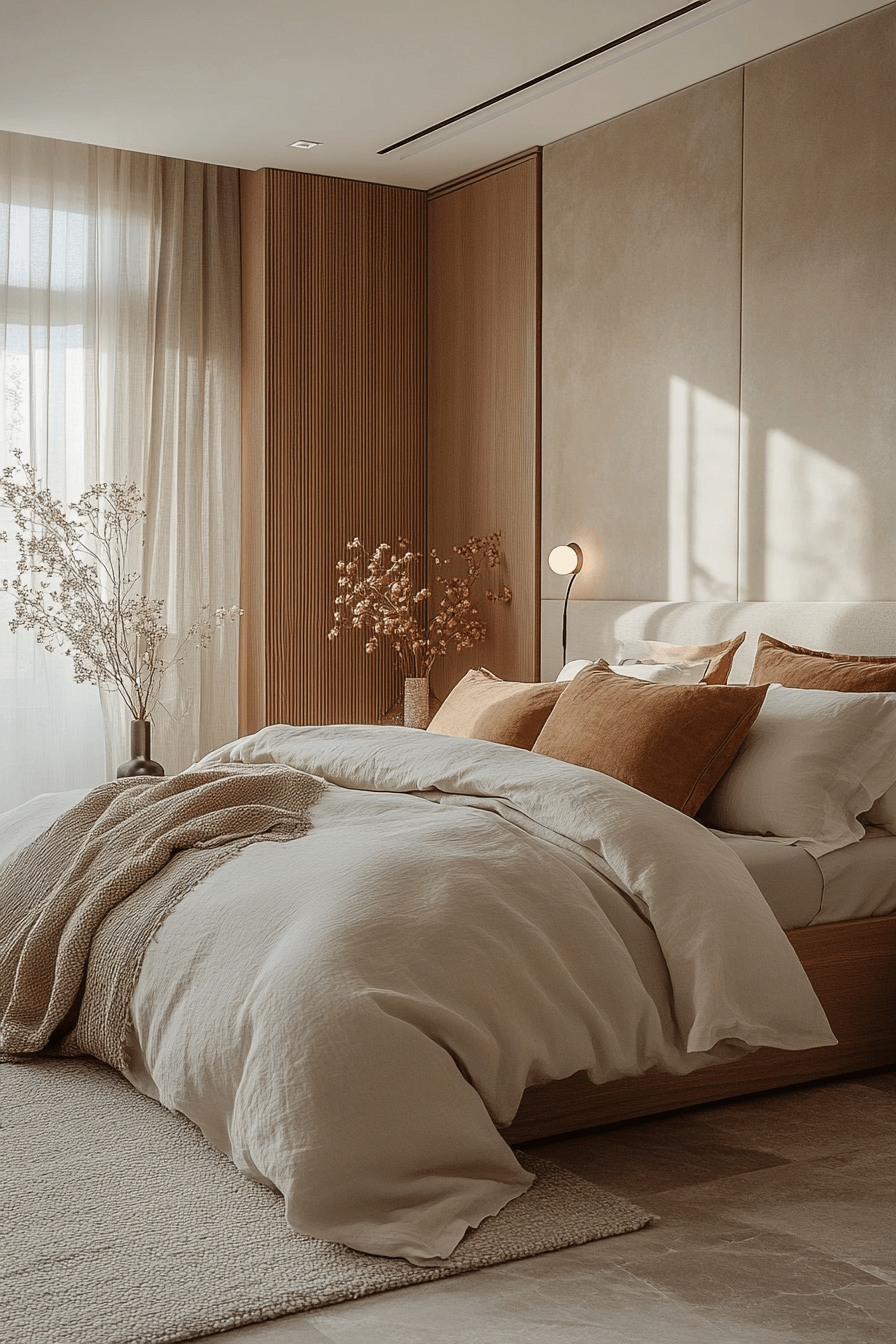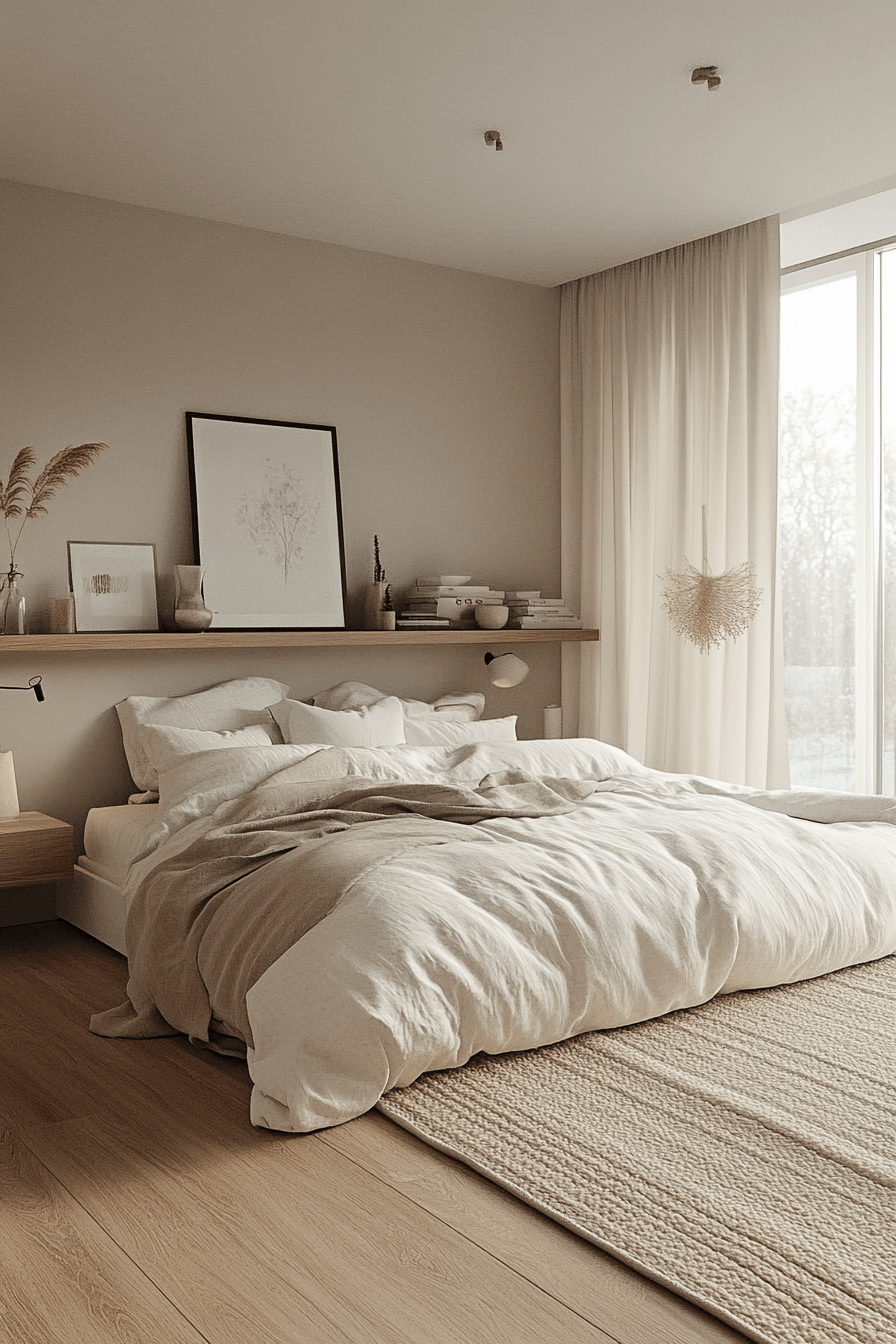 Warm neutrals gently soften the clean structure of this minimalistic bedroom. Creamy tones and subtle textures create comfort without clutter. Thoughtful decor choices add warmth while preserving simplicity. The minimalistic bedroom feels timeless and inviting. It’s a perfect place to unwind.
