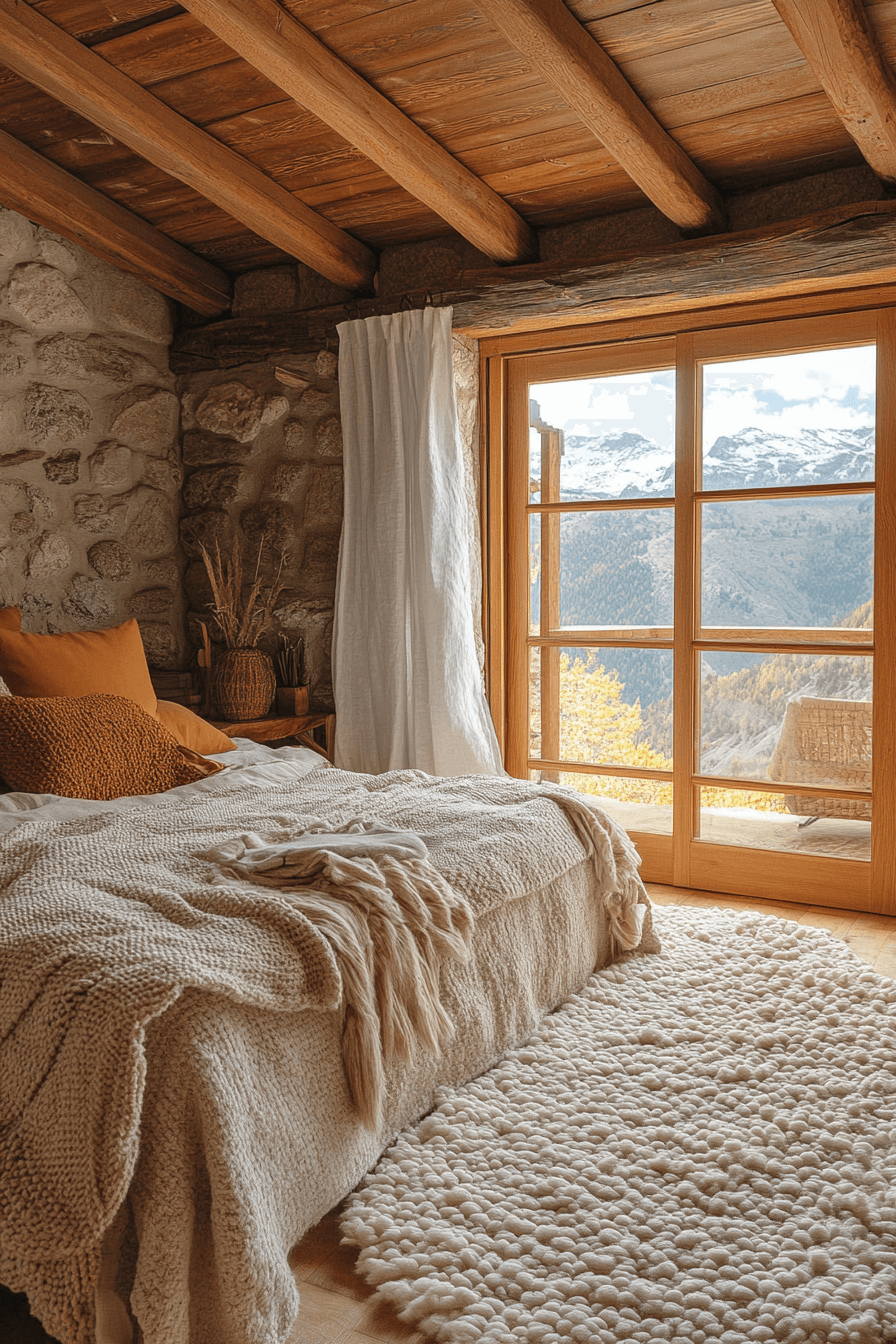 Mountain serenity influences this nature-connected minimalistic bedroom. Wood textures and expansive views ground the design. Decor remains restrained to highlight the surroundings. The minimalistic bedroom feels peaceful and expansive. Nature becomes part of the experience.