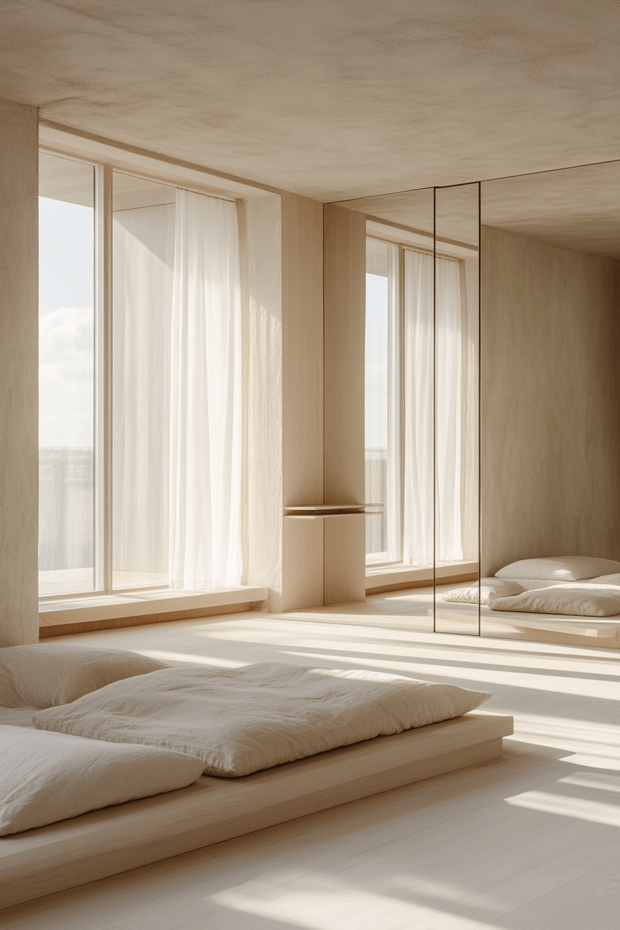 Quiet reflection is encouraged in this sanctuary-style minimalistic bedroom. Muted tones and simplified forms reduce distraction. Open space supports mental clarity and rest. The environment feels deeply soothing. This minimalistic bedroom becomes a personal retreat.
