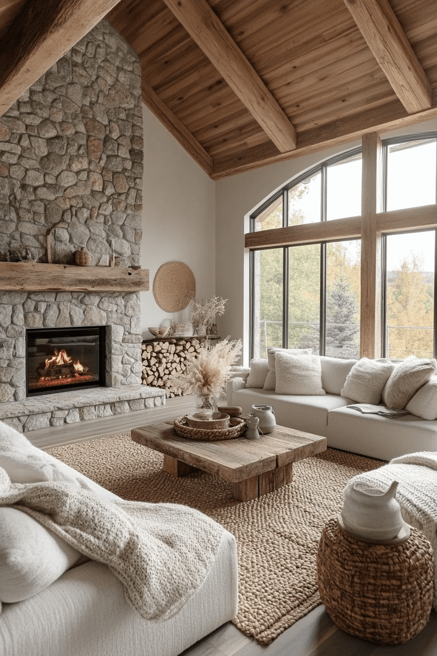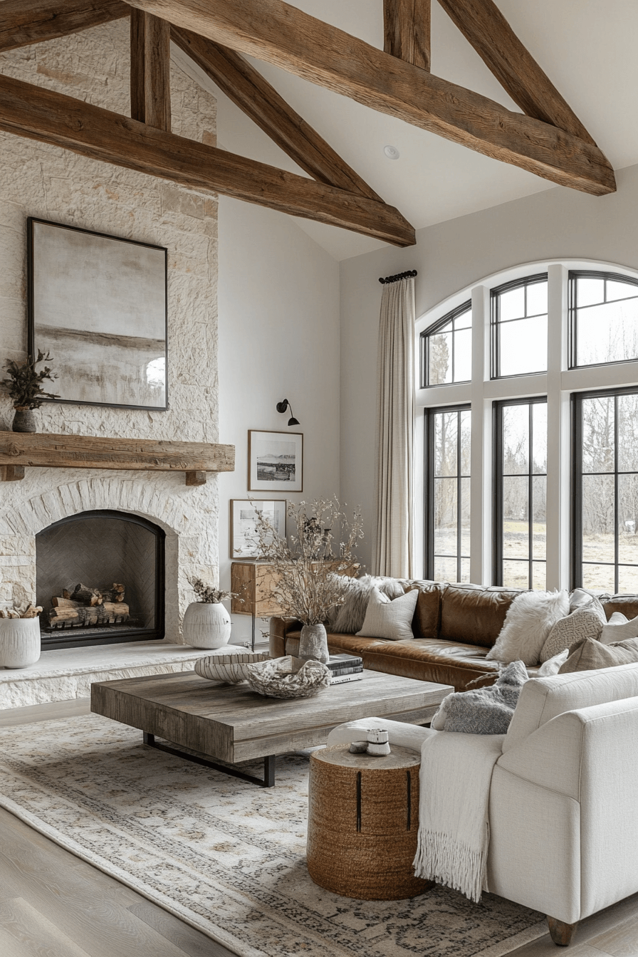Comfort takes center stage in this modern farmhouse interior living room where warmth and simplicity blend seamlessly. Exposed wood elements add rustic depth while clean-lined furniture keeps the space current. Soft neutrals create an inviting backdrop that feels open and relaxed. Layered textures provide coziness without visual overload. A statement fireplace grounds the room with charm.