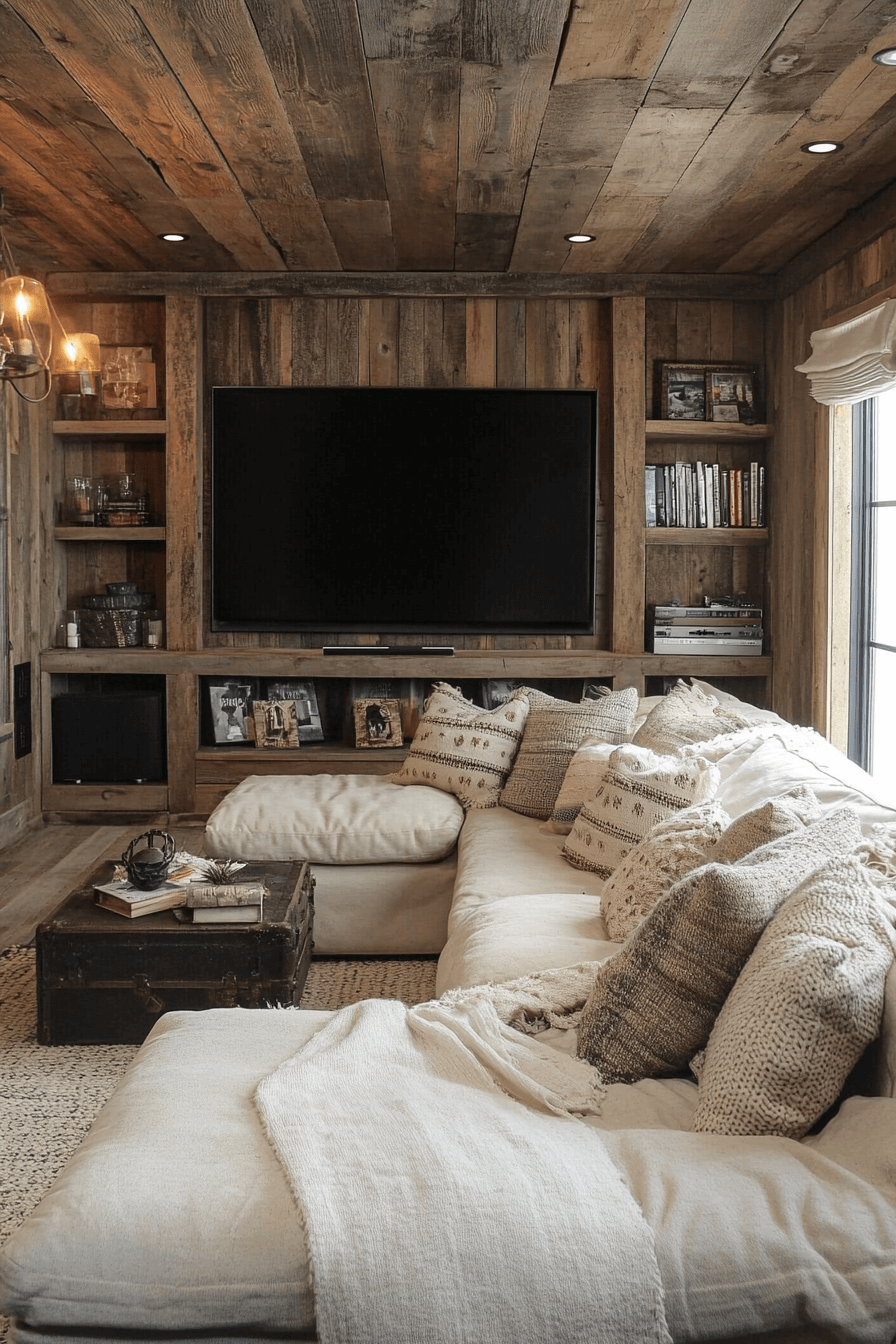 Entertainment feels elevated in a modern farmhouse interior media room with cozy appeal. Rustic finishes soften modern technology. Plush seating enhances comfort. Thoughtful accents add charm without distraction. The room feels immersive and welcoming.