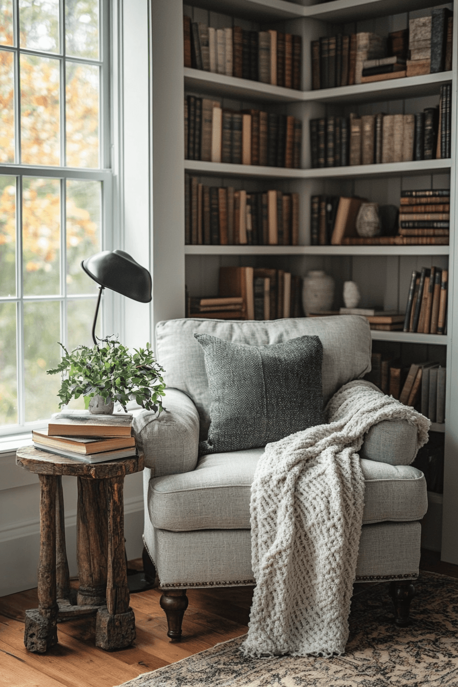 Quiet moments shine in a modern farmhouse interior reading nook designed for escape. Comfortable seating invites long stays. Natural wood framing adds warmth. Clean lighting keeps the look refined. Soft layers enhance comfort.