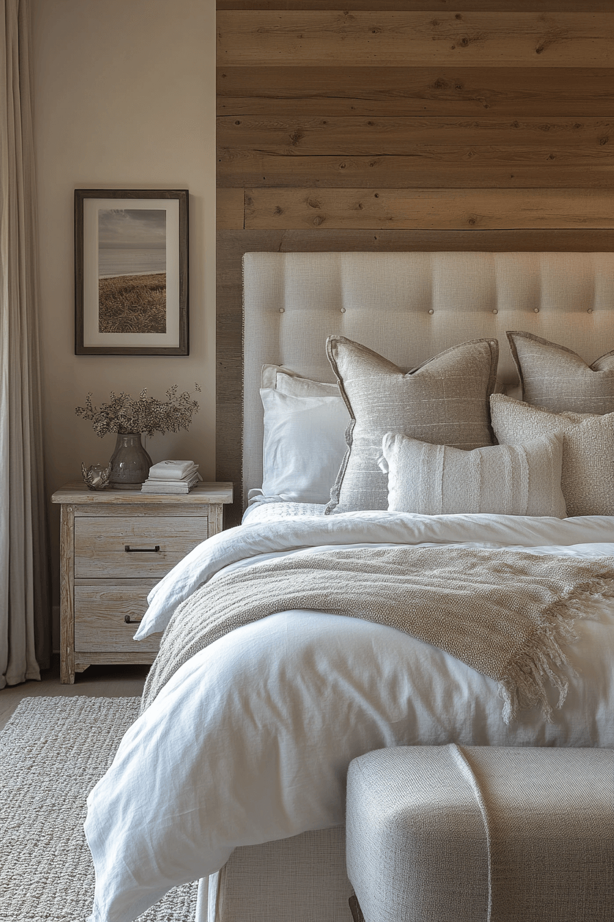 Rest comes easily in a modern farmhouse interior bedroom designed with softness in mind. Cozy layers and neutral hues encourage calm and relaxation. Weathered wood accents bring warmth and depth. Minimal decor keeps the atmosphere uncluttered and serene. Gentle lighting completes the peaceful mood.