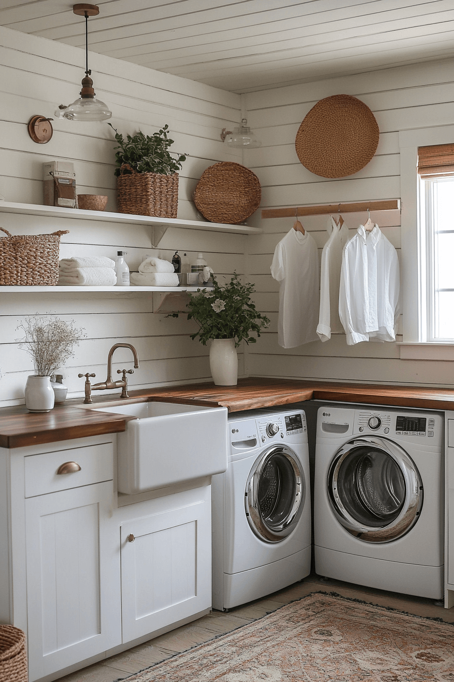 Function meets beauty in a modern farmhouse interior laundry room designed to inspire. Clean cabinetry keeps everything organized. Farmhouse accents add personality. Durable surfaces support daily use. The space feels bright and efficient.