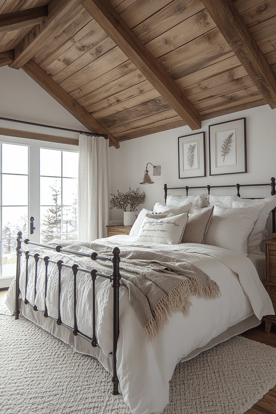 Drama meets comfort in a modern farmhouse interior loft bedroom. Vaulted ceilings enhance spaciousness. Exposed beams add character. Cozy layers soften architecture. Natural light fills the room.