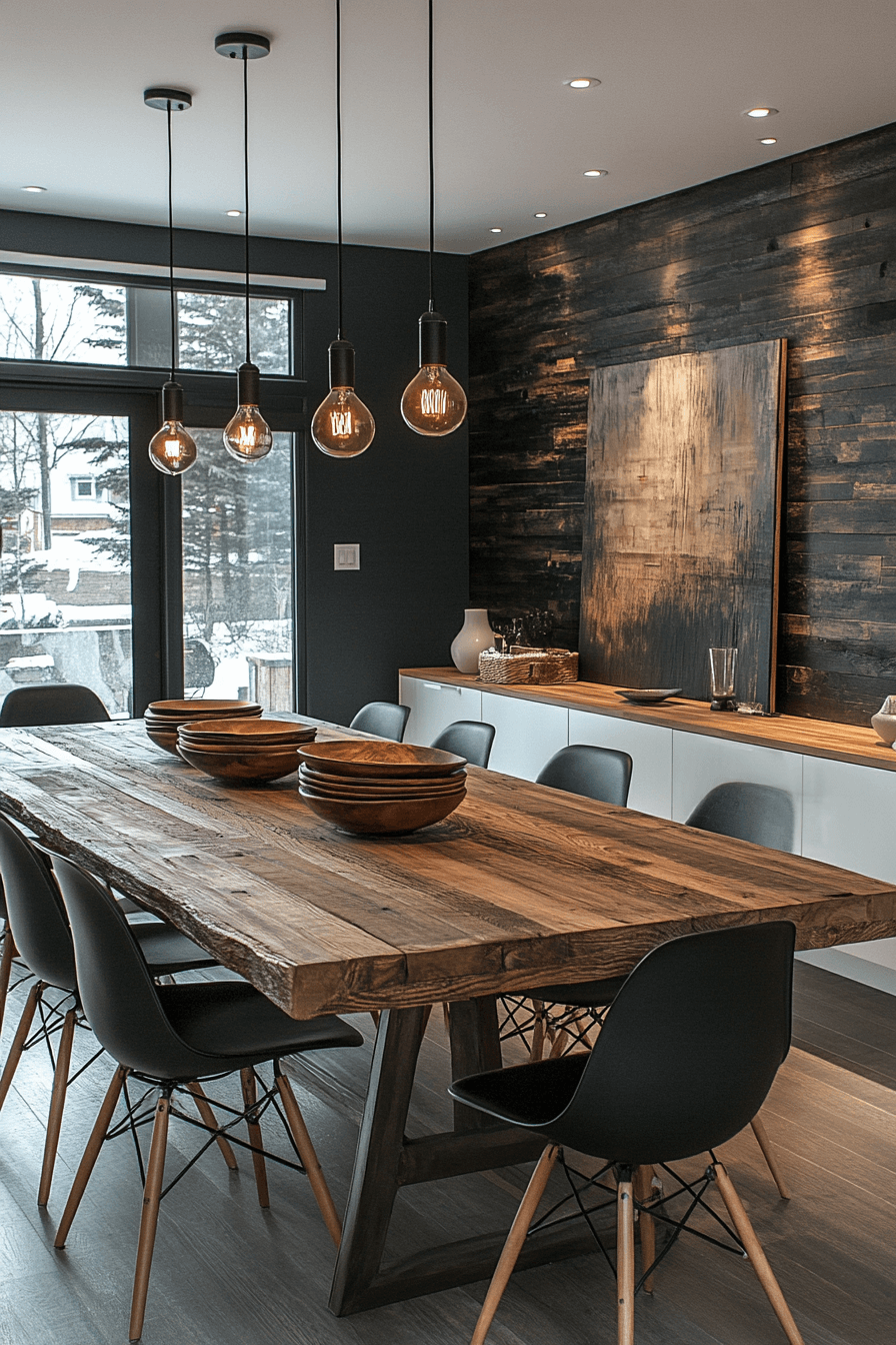 Striking contrast defines this modern farmhouse interior that leans bold and modern. Industrial elements add edge while reclaimed wood keeps it grounded. Clean silhouettes maintain balance. The space feels confident yet inviting. Storage and decor work together seamlessly.