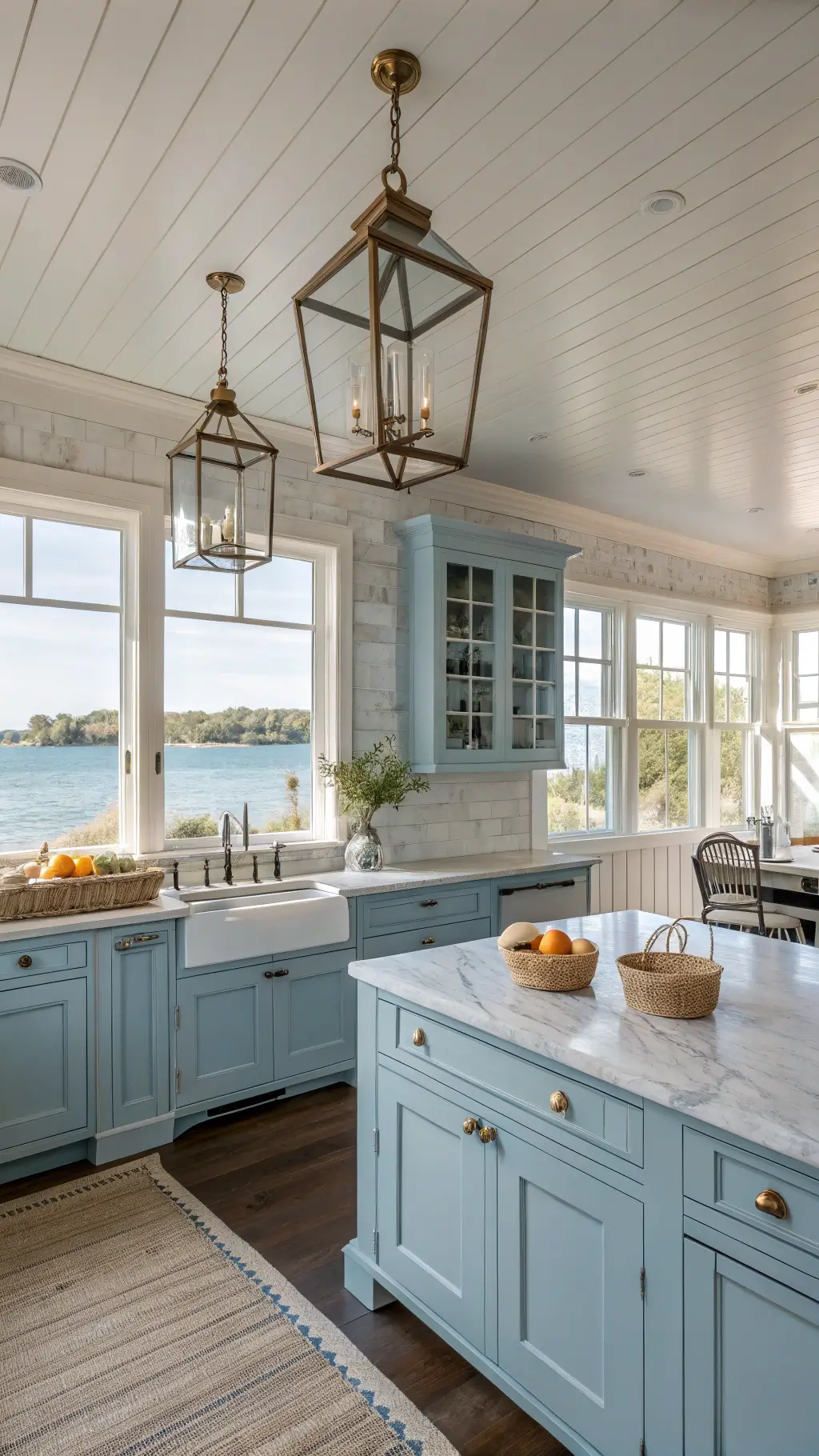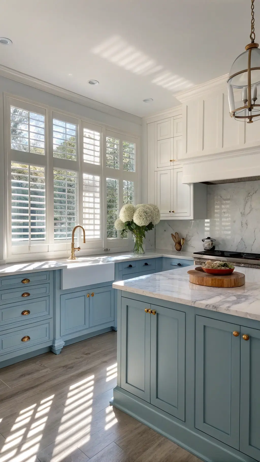 "Modern, sunlit kitchen with powder blue Shaker-style cabinets, white marble countertops, and a weathered oak island, featuring fresh hydrangeas and seaside accents."