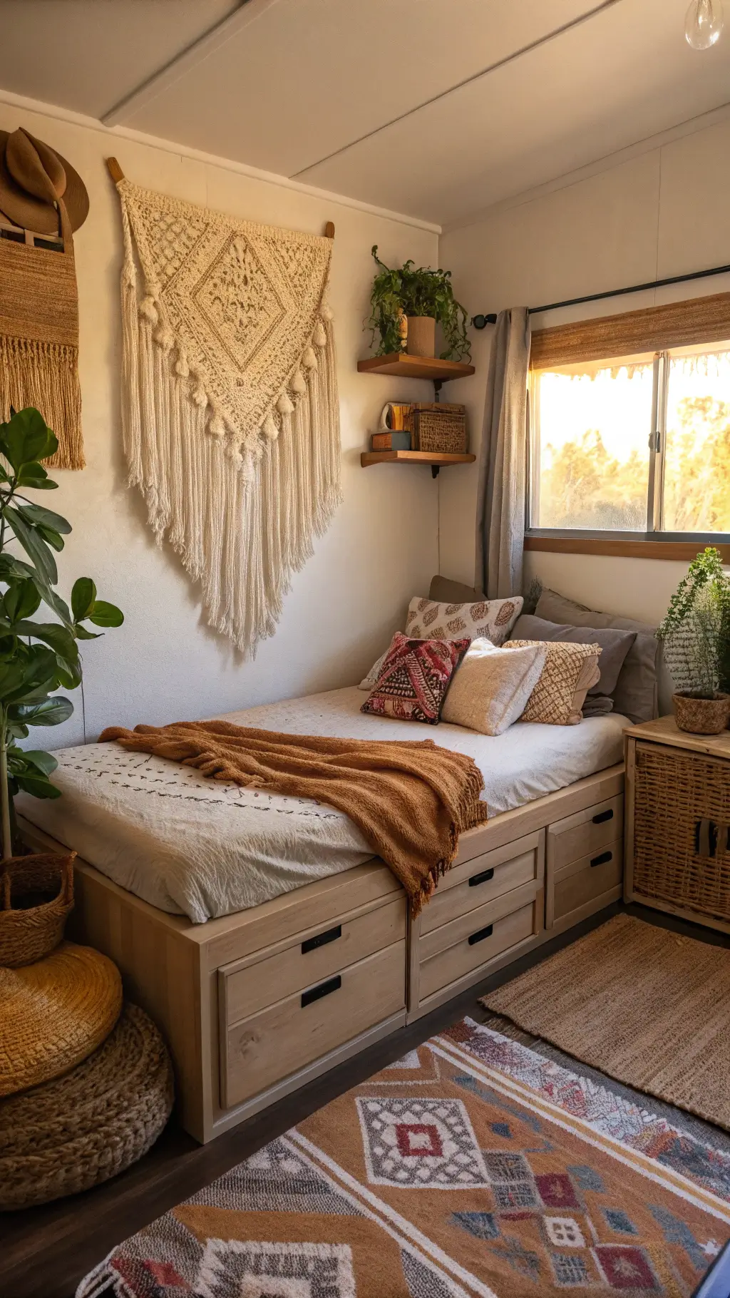 Cozy 10'x12' bedroom with morning light streaming through tall window, showcasing a bed with built-in drawers, floating walnut shelves, brass wall sconces, and a round mirror. The room decor is predominantly in soft neutrals, with layers of texture from wool, linen, and woven materials.