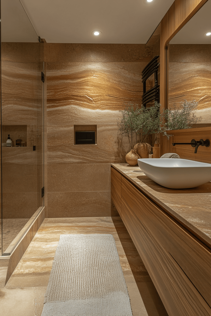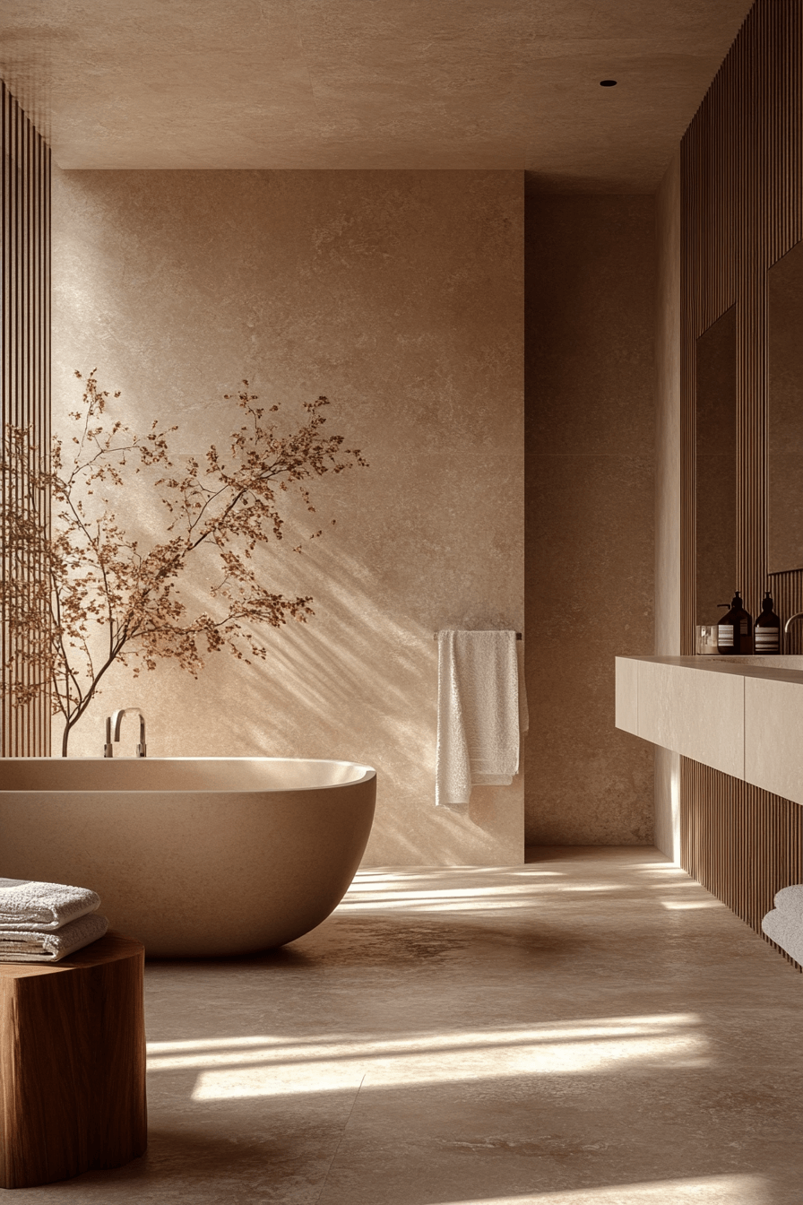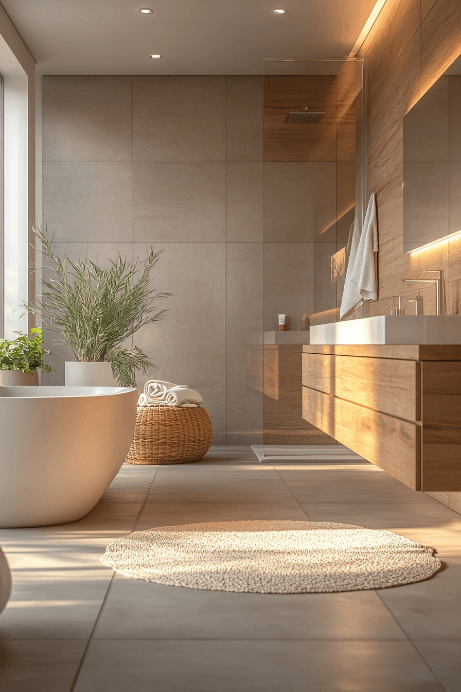 Warm natural tones can transform zen bathroom decor ideas into a cozy yet refined retreat. Shades like soft clay and warm sand create a comforting environment. Natural materials such as wood and stone deepen the organic feel. Soft lighting enhances the warmth and serenity of the space. These zen bathroom decor ideas show how warmth and calm can coexist beautifully. Discover more cozy yet tranquil bathroom ideas.