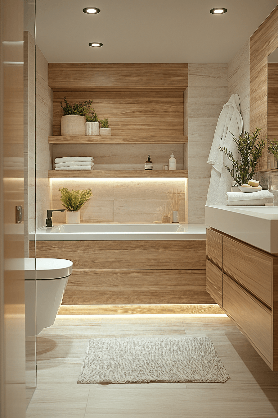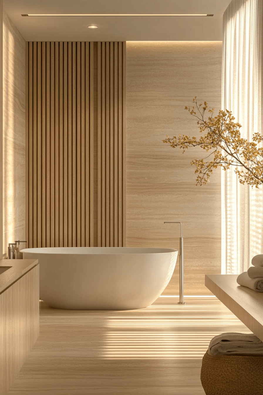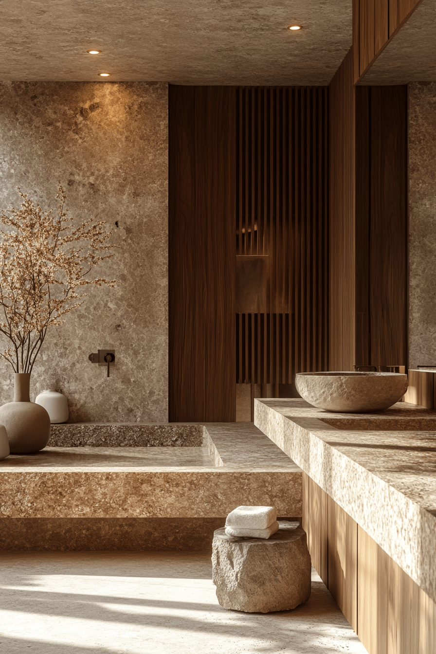 Warm natural tones can transform zen bathroom decor ideas into a cozy yet refined retreat. Shades like soft clay and warm sand create a comforting environment. Natural materials such as wood and stone deepen the organic feel. Soft lighting enhances the warmth and serenity of the space. These zen bathroom decor ideas show how warmth and calm can coexist beautifully. Discover more cozy yet tranquil bathroom ideas.