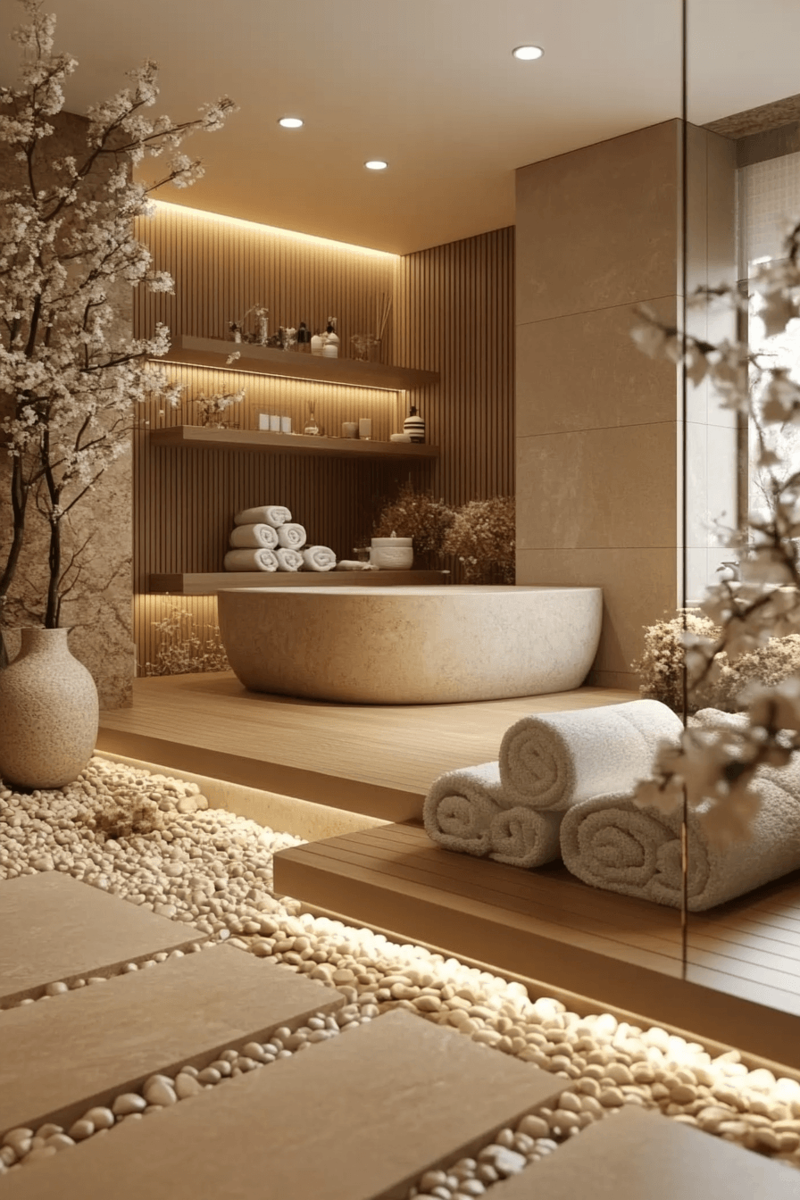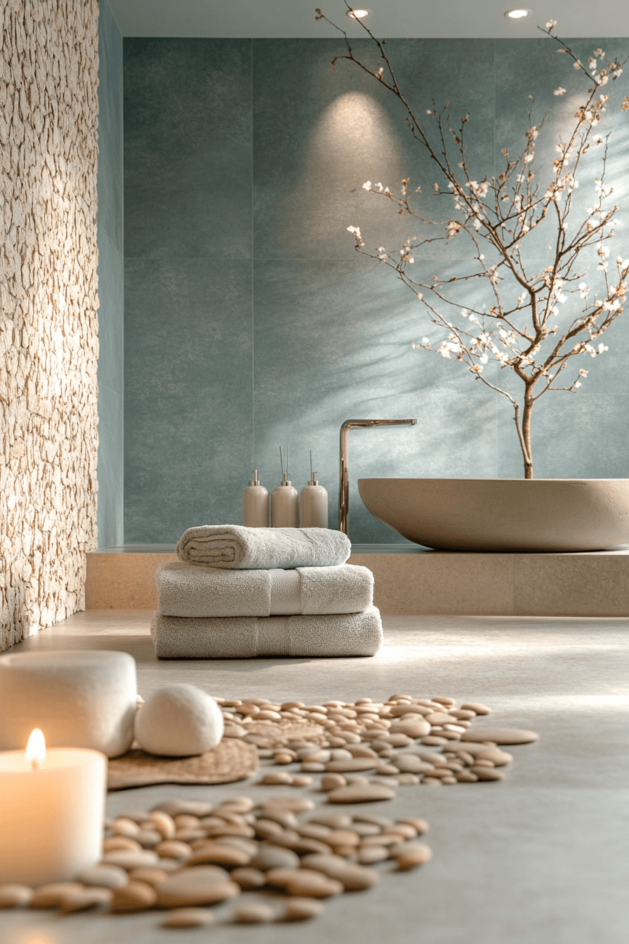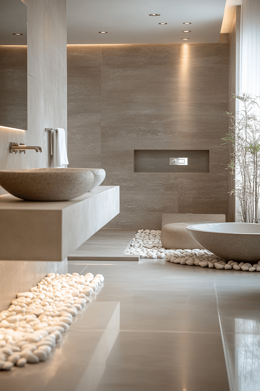 Incorporating natural elements instantly enhances the tranquility of beautiful zen bathroom decor ideas. Stone textures and subtle water features introduce a grounded, calming energy. The contrast between still surfaces and flowing water creates a soothing balance. This combination encourages relaxation while adding visual depth. These zen bathroom decor ideas transform your bathroom into a nature-inspired escape. Discover more ways to bring organic beauty into your space.