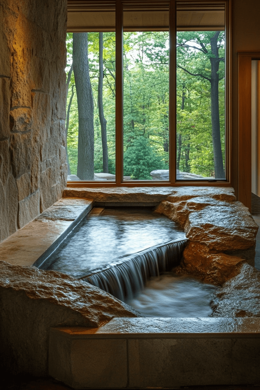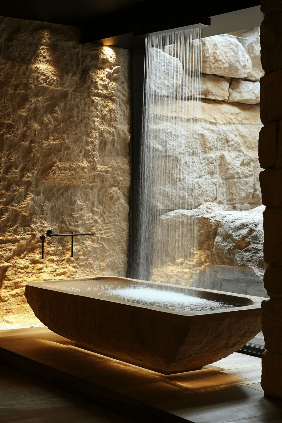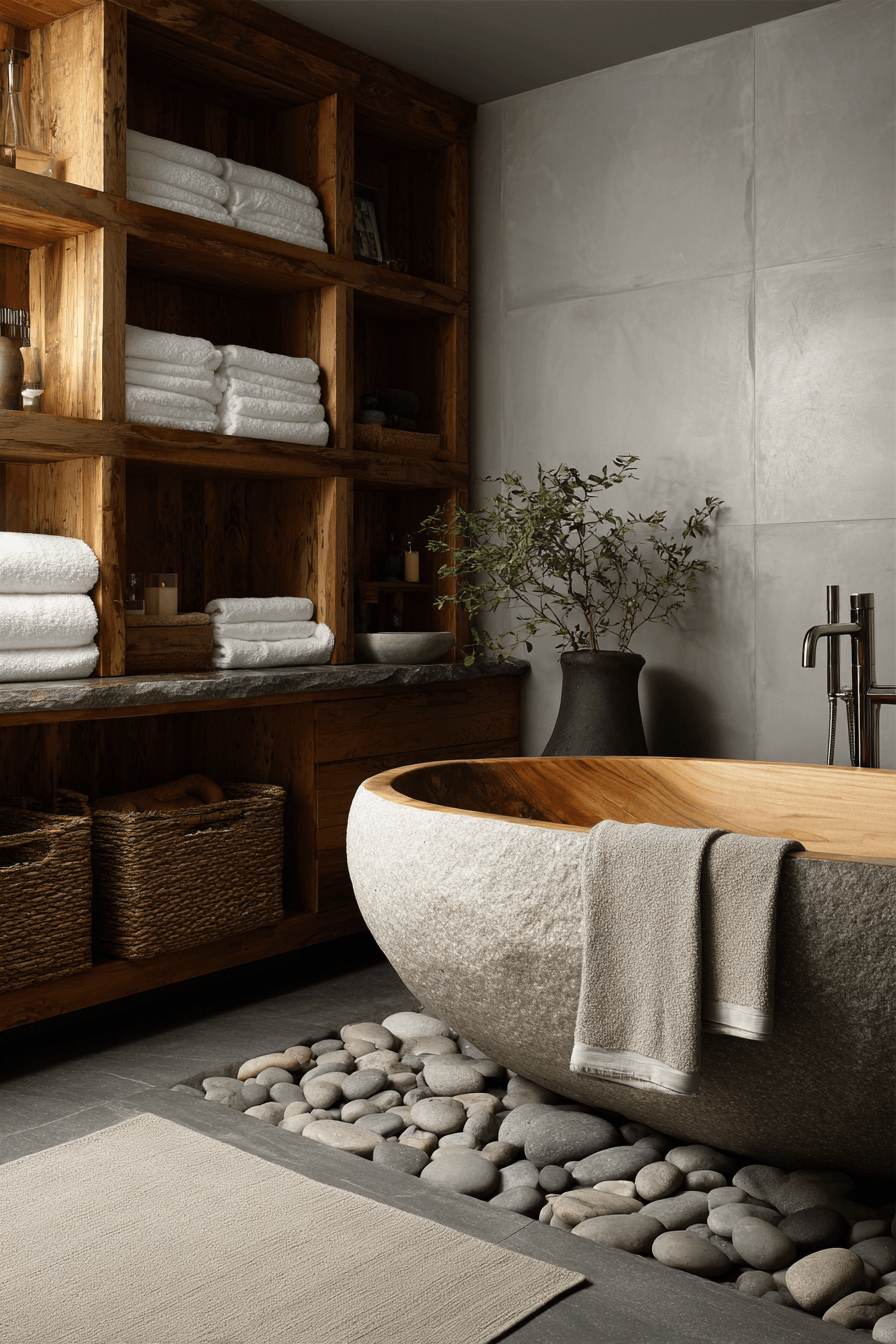 Incorporating natural elements instantly enhances the tranquility of beautiful zen bathroom decor ideas. Stone textures and subtle water features introduce a grounded, calming energy. The contrast between still surfaces and flowing water creates a soothing balance. This combination encourages relaxation while adding visual depth. These zen bathroom decor ideas transform your bathroom into a nature-inspired escape. Discover more ways to bring organic beauty into your space.